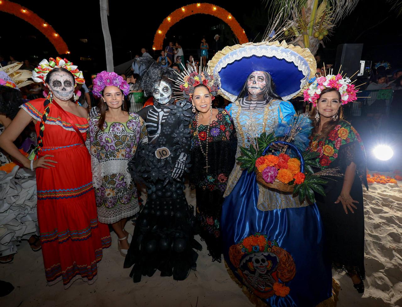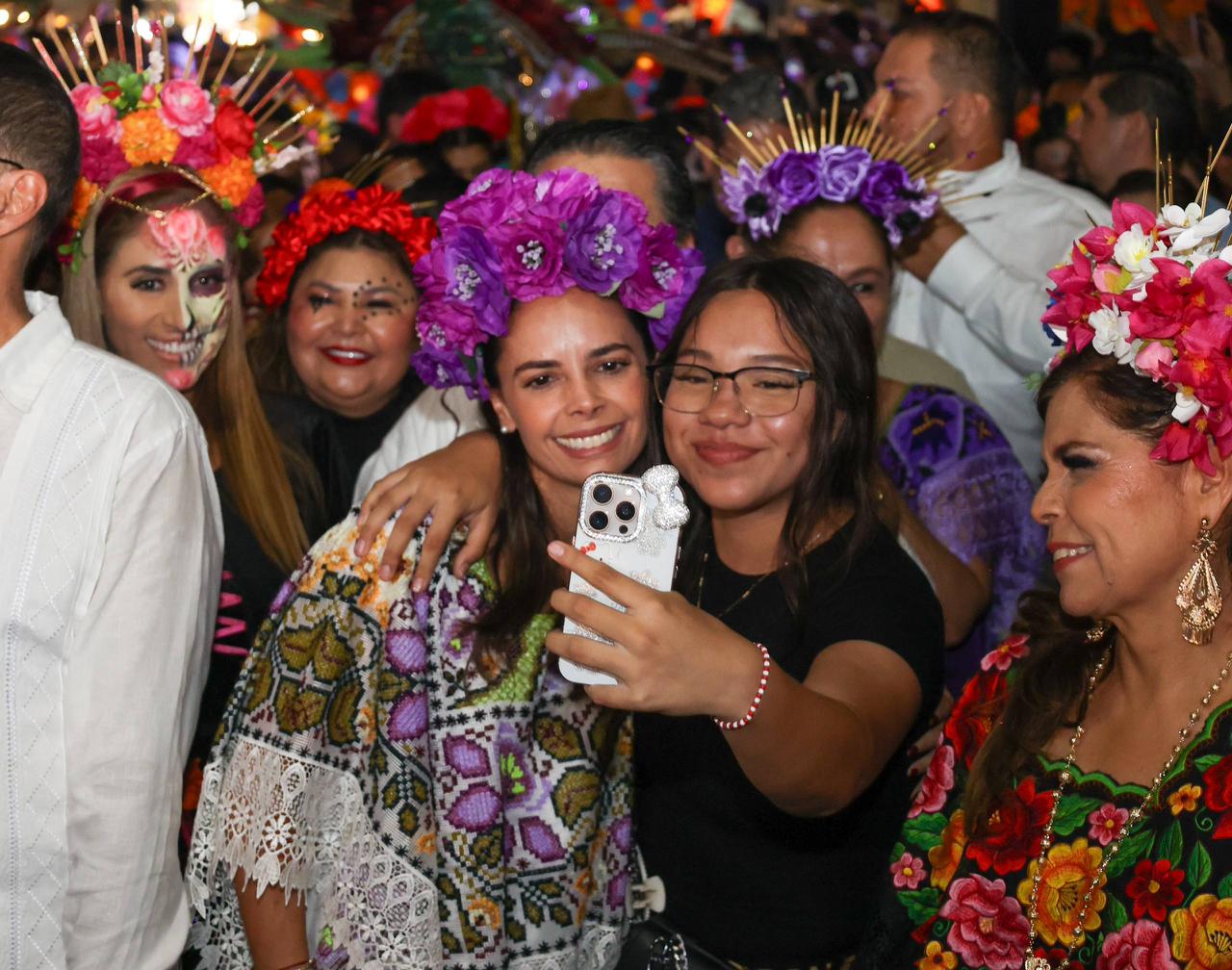 Vistiendo de un atuendo tradicional de la Península de Yucatán y una corona de flores, la Alcaldesa, la Gobernadora y la presidenta honoraria del Sistema DIF Estatal, Verónica Lezama Espinosa, caminaron en el clásico desfile que partió desde el muelle de la calle 45 hasta la entrada de esta histórica subdelegación, abarrotada de 120 stands de artesanos y empresarios, 50 gastronómicos y 51 altares, con un recorrido que transmitió un festín visual a través de calaveras danzantes, comparsas multicolores y figuras alegóricas que se mezclaron con la alegría de las familias, turistas y vecinos que disfrutaron al ritmo de la música mexicana.