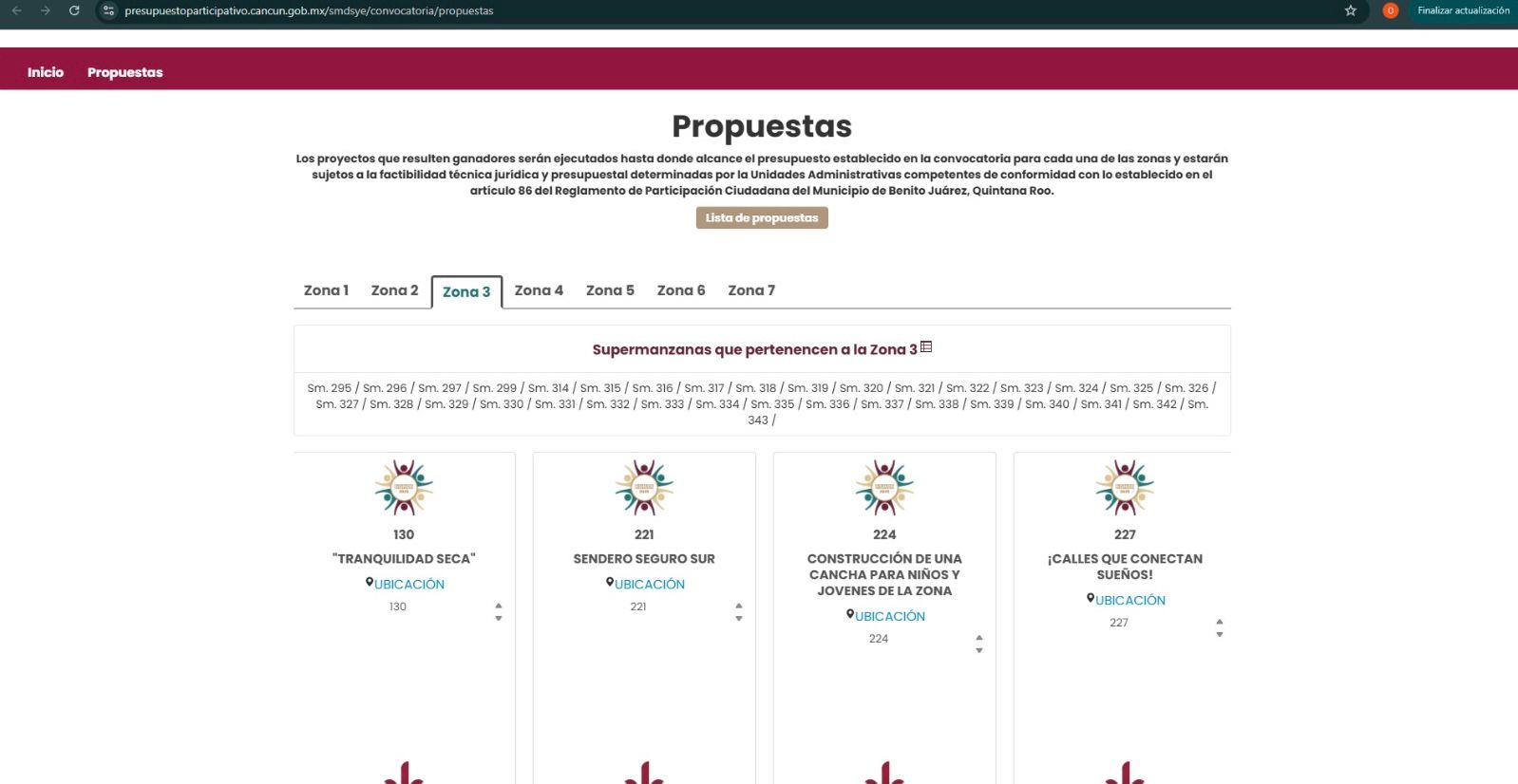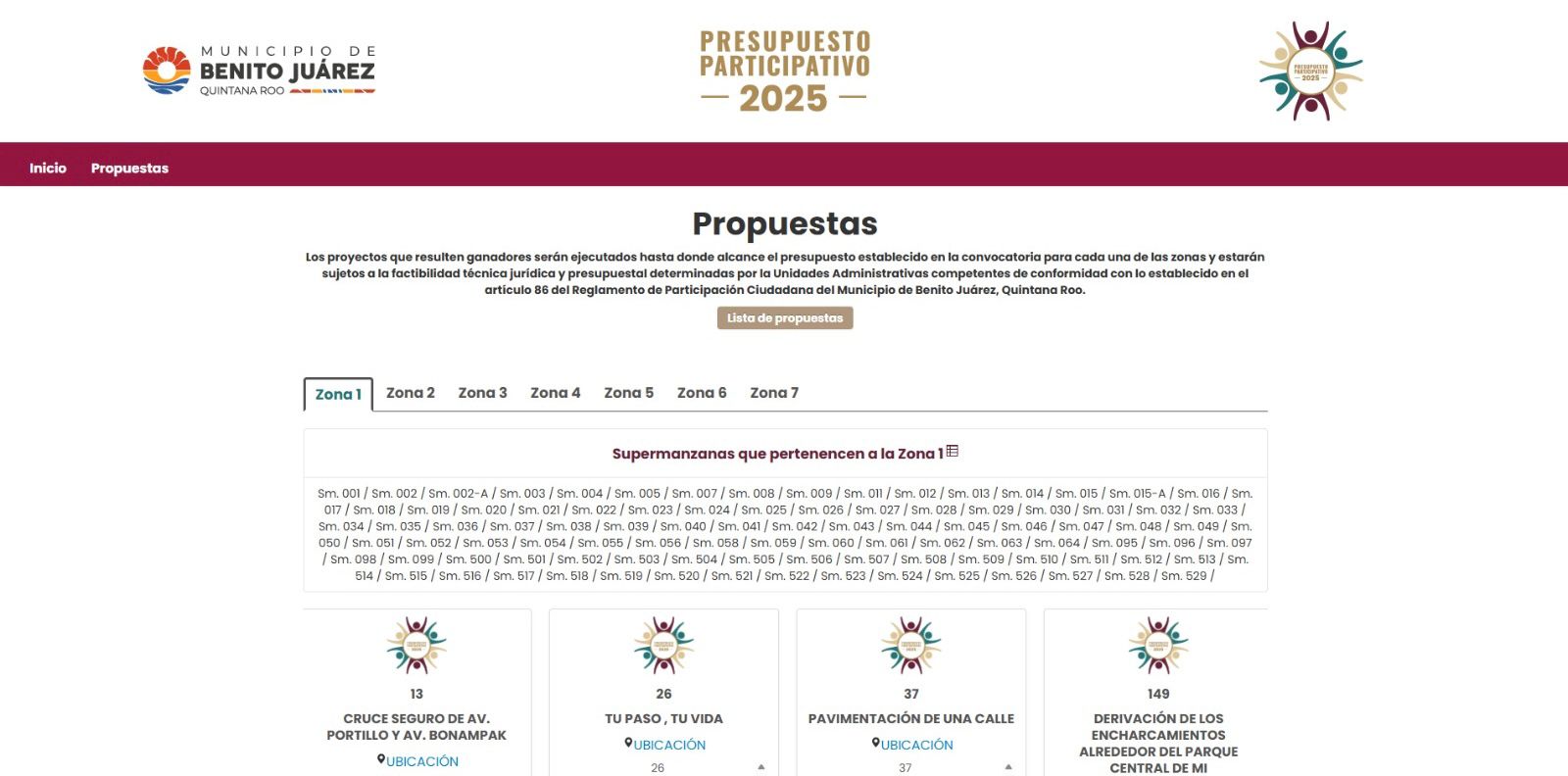 Cancún, Q. R., a 03 de noviembre de 2025.- Un total de 121 proyectos fueron aprobados para someterse a votación dentro del Presupuesto Participativo 2025, que se ejercerá durante el 2026, por lo que la Presidenta Municipal, Ana Paty Peralta, informó que 35 corresponden a la Zona 1; 1 a la Zona 2; 8 a la Zona 3; 9 a la Zona 4; 19 a la Zona 5; 29 a la Zona 6;y 20 a la Zona 7, reflejando la amplia diversidad de propuestas que buscan mejorar la infraestructura, los servicios y los espacios públicos de Cancún.