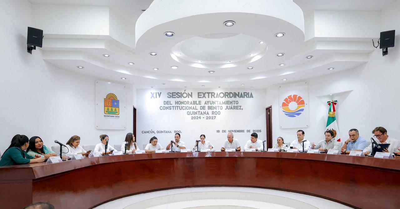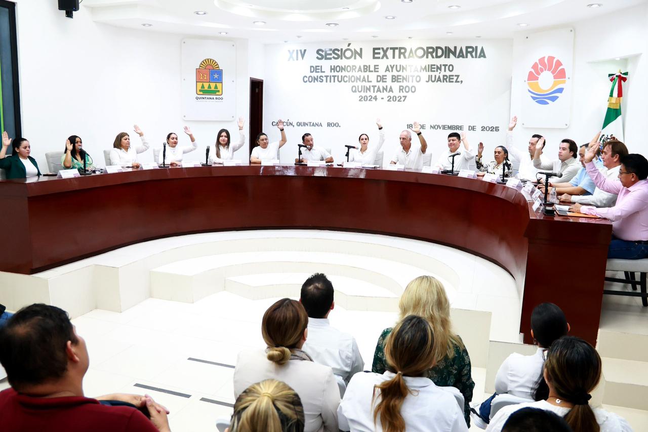 Cancún, Q. R., a 18 de noviembre de 2025.- En el marco de la Décima Cuarta Sesión Extraordinaria de Cabildo, la Presidenta Municipal, Ana Paty Peralta, junto al cuerpo colegiado, aprobó por mayoría de votos las iniciativas de Reforma a la Ley de Hacienda y la Ley de Ingresos del Municipio de Benito Juárez para el ejercicio fiscal 2026, que contempla esta última un incremento del 8.08% en comparación al 2025, sin crear nuevos impuestos y considerando la economía de las familias cancunenses.