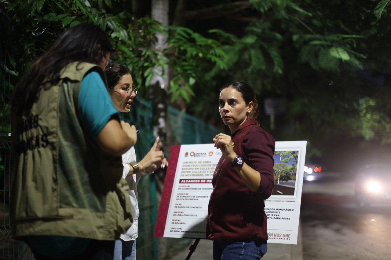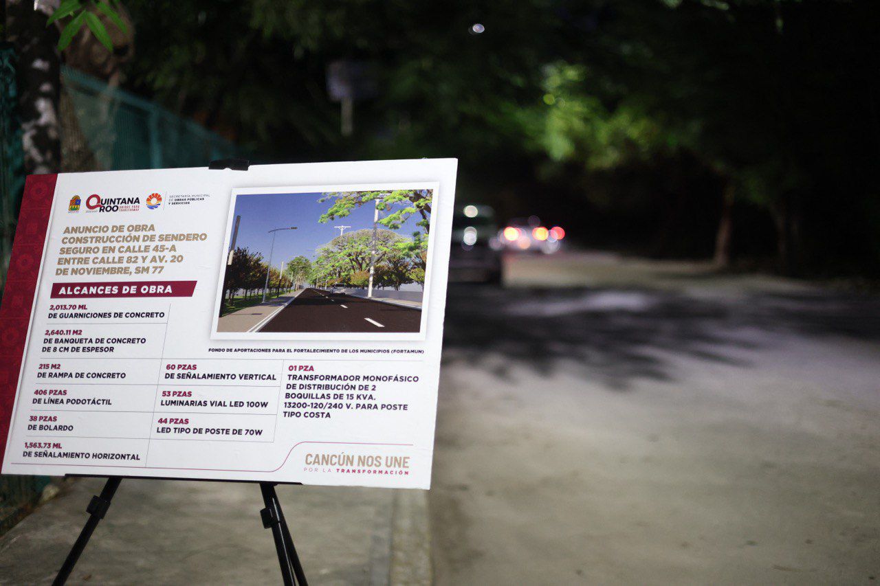 Cancún, Q. R., a 10 de diciembre de 2025.- La Presidenta Municipal, Ana Paty Peralta, informó el inicio de la obra de la construcción del sendero seguro en la calle 45-A entre calle 82 y avenida 20 de noviembre en la Supermanzana 77, un proyecto que dejará la zona más iluminada y accesible para los vecinos de Corales, de Tabachines, Gastronómicos y para los estudiantes de la Universidad del Caribe.