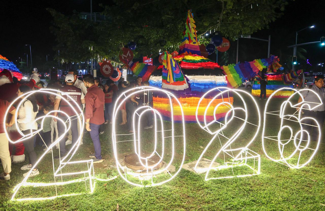 tres piñatas grandes a ras de piso, esferas azules y un letrero de 2026.
