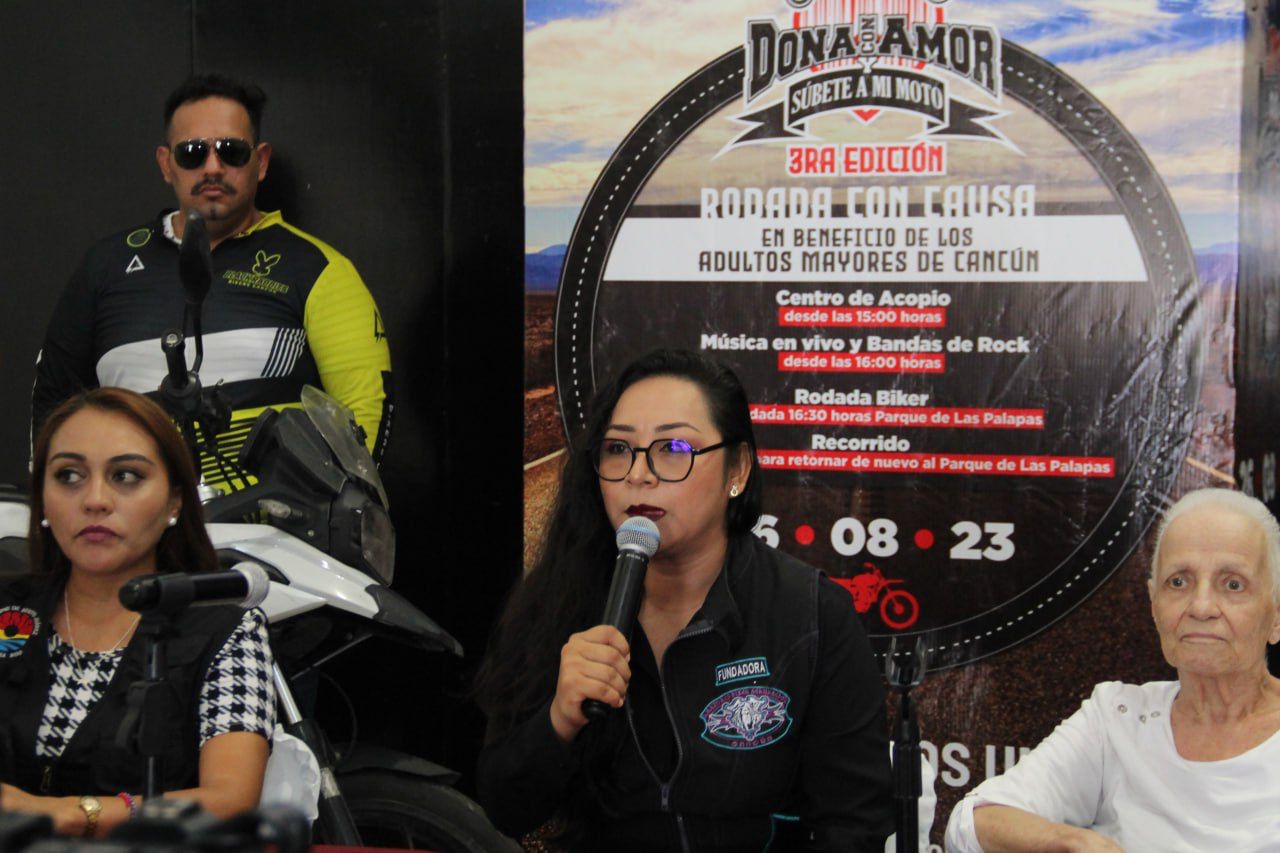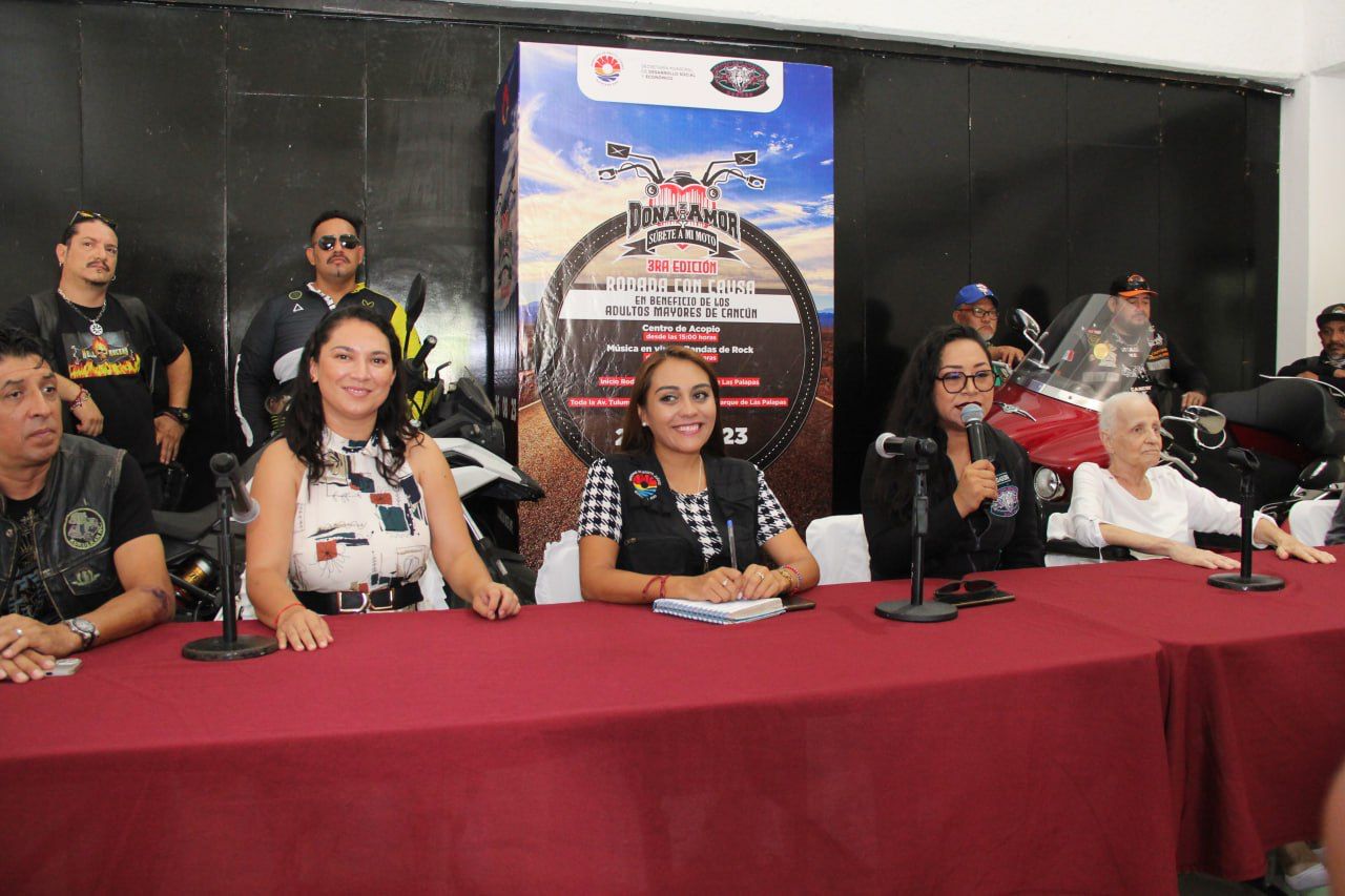 Cancún, Q. R., a 31 de julio de 2023.- En el marco del Día del Adulto Mayor, que se conmemora el 28 de agosto, se realizó una conferencia de prensa en la que se presentó la tercera edición de la rodada con causa “Dona con amor y súbete a mi moto”, la cual se llevará a cabo este 26 de julio del 2023, con salida en el Parque de las Palapas, con el objetivo de este evento es ayudar a los Adultos Mayores.