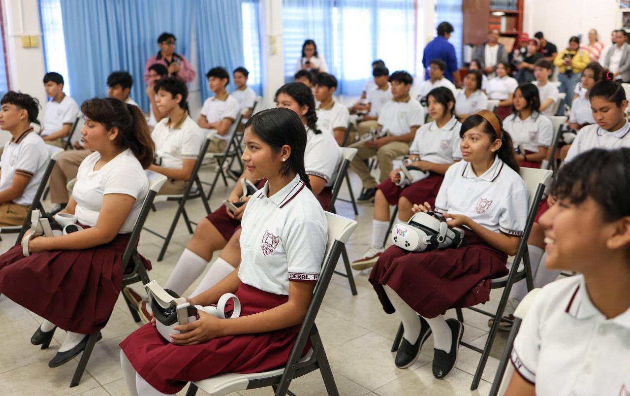 Cancún, Q. R., a 27 de enero de 2026.- “La secundaria es de las mejores etapas de su vida pero también es la más complicada, todos somos seres humanos y todos nos podemos equivocar, aquí es cuestión de saber qué hacer cuando uno se equivoca, regresar y tomar una buena decisión”, señaló la Presidenta Municipal, Ana Paty Peralta, al llevar el programa “Vive libre”, experiencia de Realidad Virtual a 553 estudiantes de la Escuela Secundaria General No. 14 “Los Corales”.
