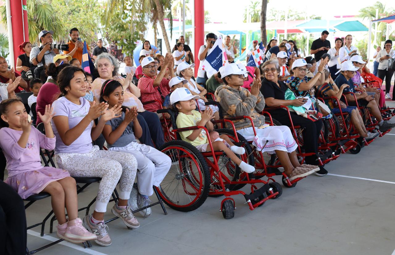 Cancún, Q. R., a 05 de marzo de 2026.- La Presidenta Municipal, Ana Paty Peralta, participó en la entrega de 20 sillas de ruedas y 10 bicicletas a beneficiarios cancunenses, como parte de las acciones con causa que impulsa el Rally Maya México, en coordinación con el Sistema DIF Quintana Roo, así como fundaciones y empresas aliadas.