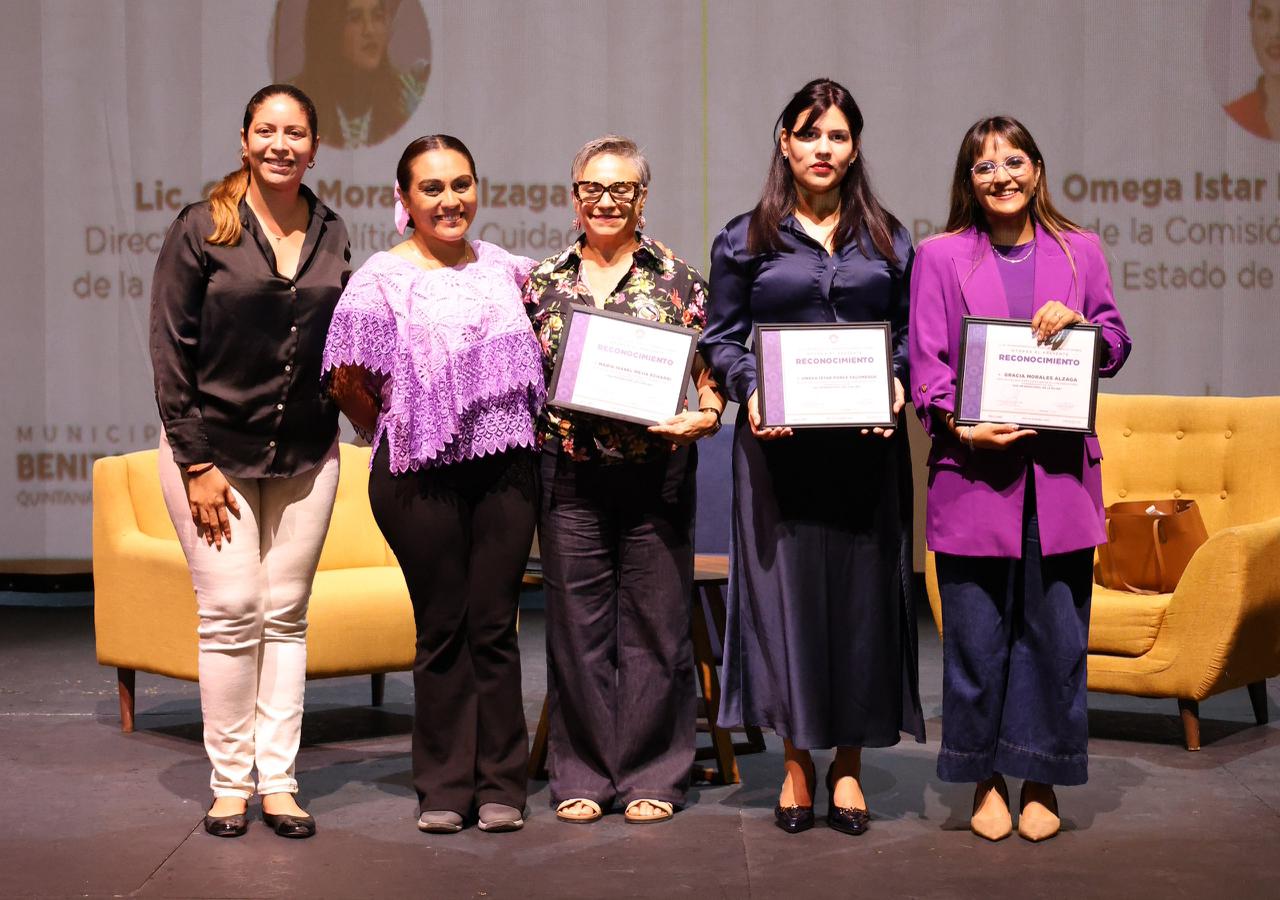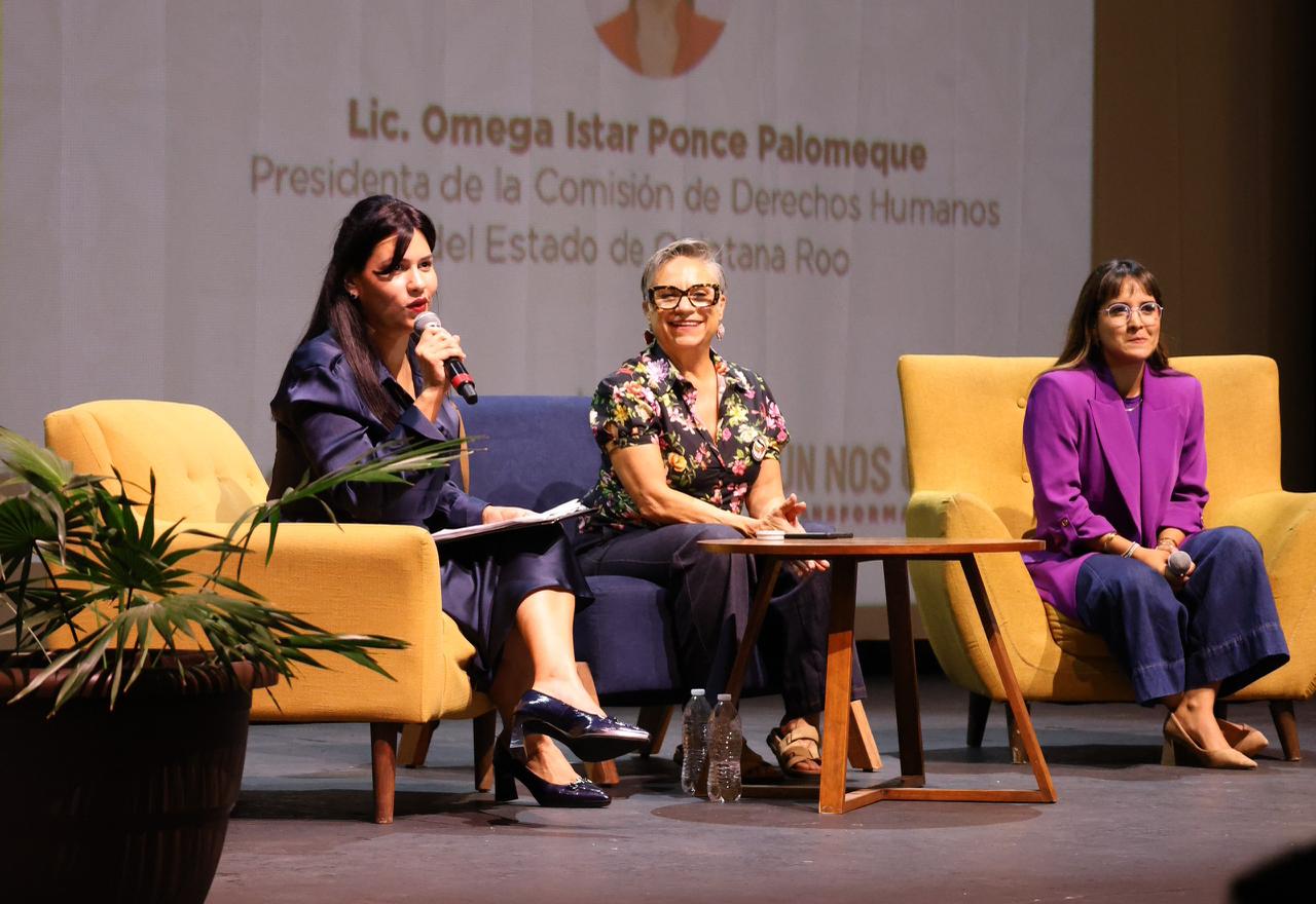 Esta exposición contó con la presidenta de la Comisión de Derechos Humanos del Estado de Quintana Roo, Omega Istar Ponce Palomeque y la directora de Políticas de Cuidado en la Secretaría de las Mujeres, Gracia Morales Alzaga, quienes abordaron temas relacionados con los derechos de las mujeres, las relaciones igualitarias y la construcción de comunidad.