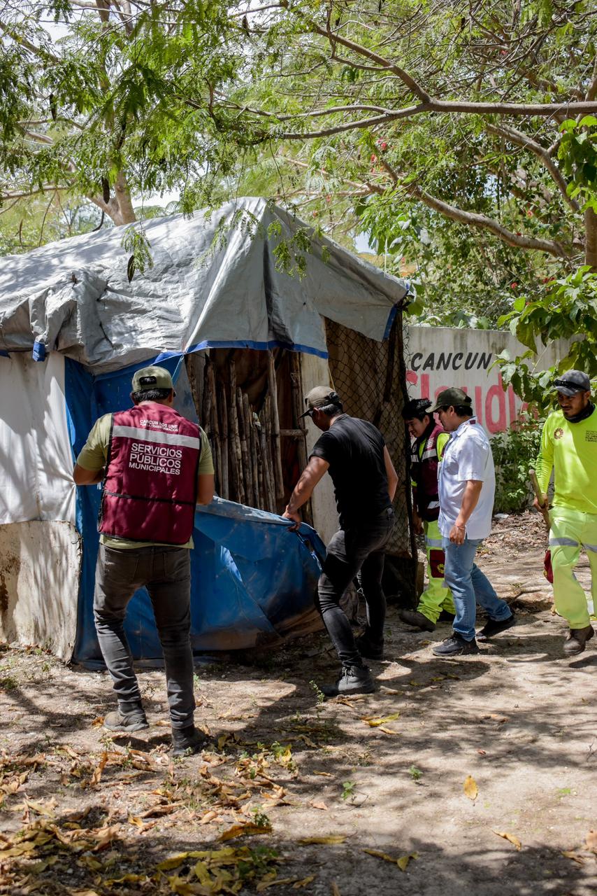 Cancún, Q. R., a 12 de marzo de 2026.- Por instrucciones de la Presidenta Municipal, Ana Paty Peralta, el secretario general del Ayuntamiento de Benito Juárez, Pablo Gutiérrez Fernández, atendió un reporte ciudadano a un parque público de la Supermanzana 223, donde una persona en situación de calle, con aparentes problemas de adicción, había ocupado de manera ilegal el espacio instalando una choza.