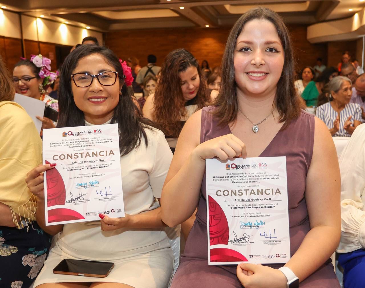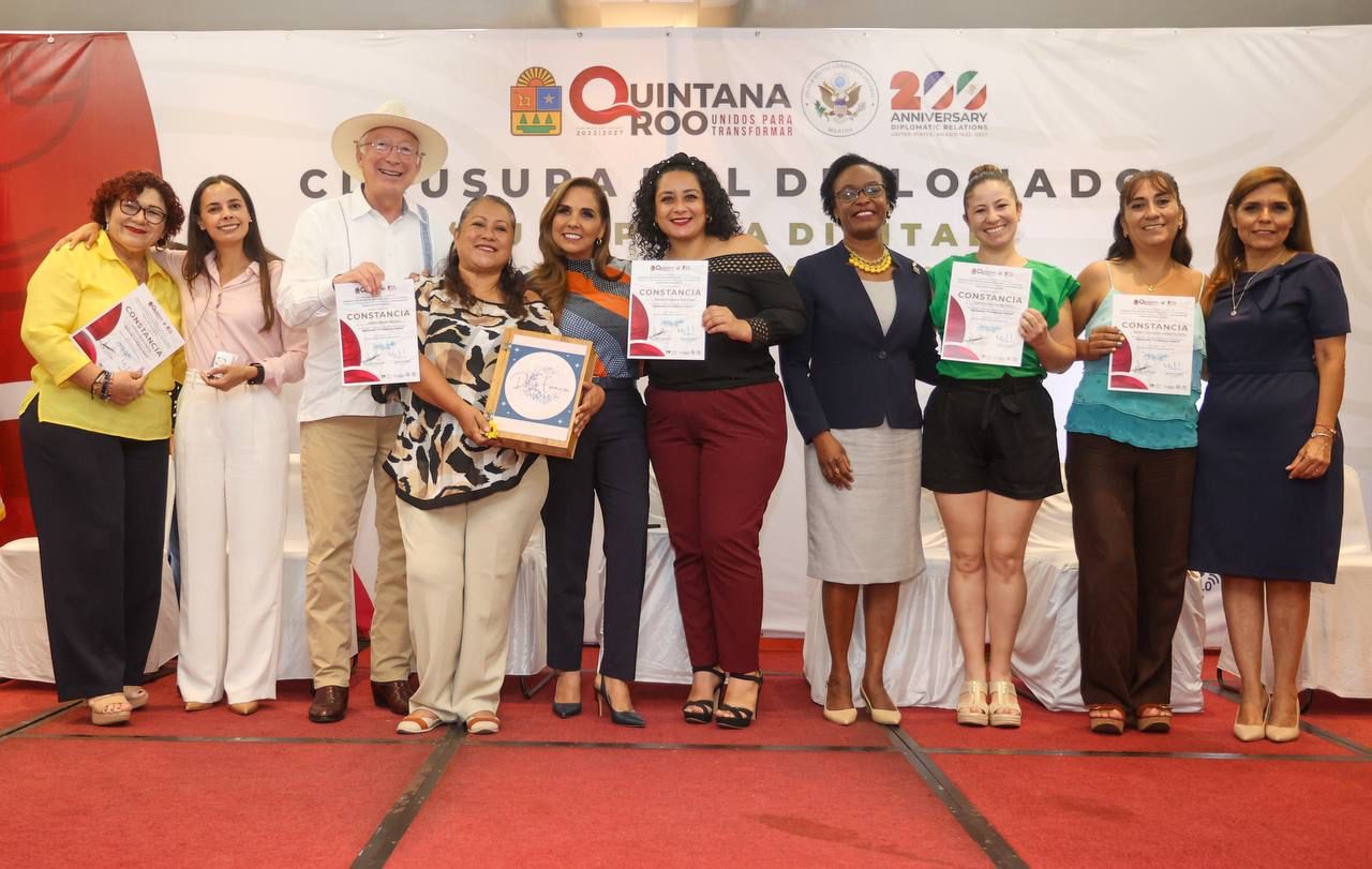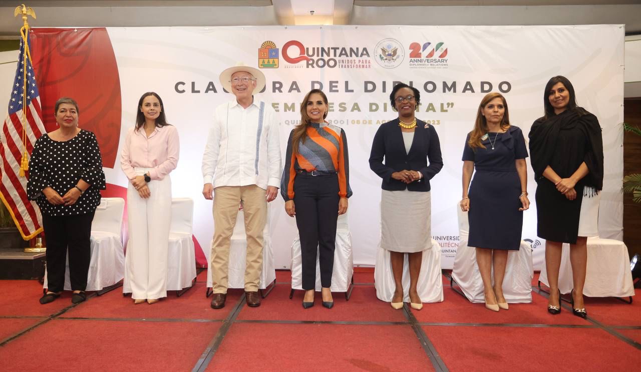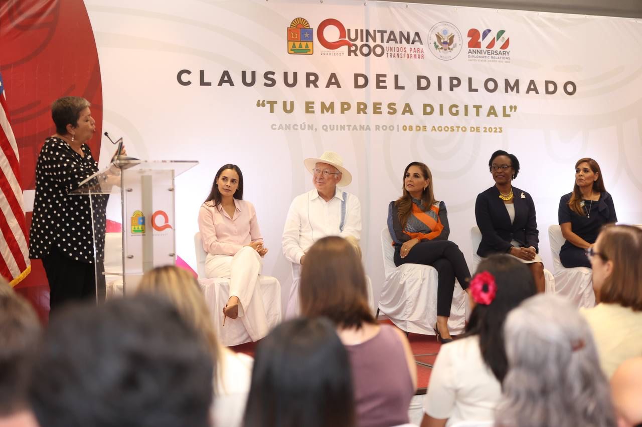 Cancún, Q. R., a 08 de agosto de 2023.- La Presidenta Municipal de Benito Juárez, Ana Paty Peralta, participó junto al Embajador de Estados Unidos en México, Ken Salazar y la gobernadora Mara Lezama, la entrega de reconocimientos a mujeres emprendedoras quintanarroenses por haber concluido el diplomado “Tu empresa digital”, con el objetivo de actualizarse en el uso de tecnologías, formalización y formación integral para un empoderamiento y crecimiento económico.