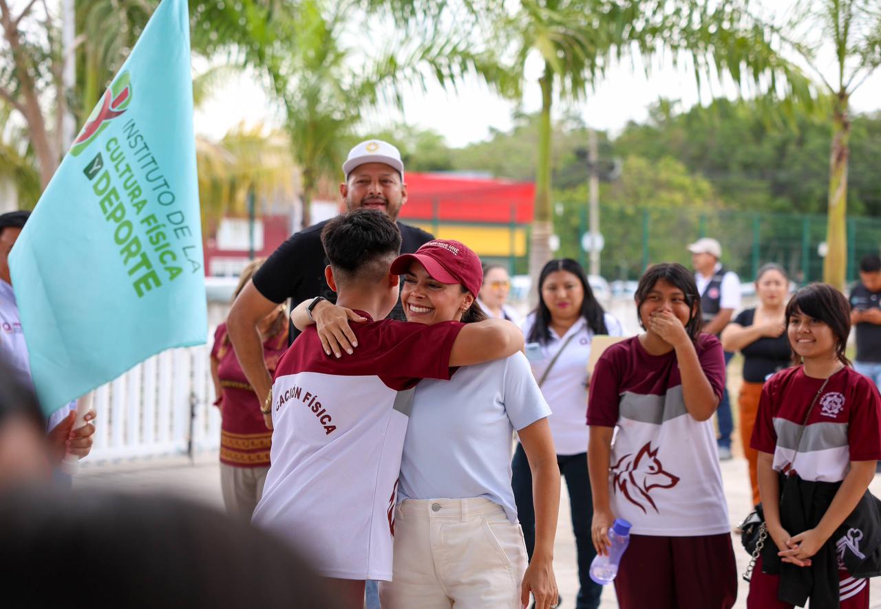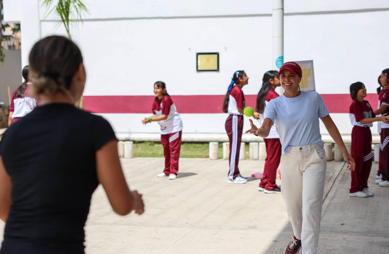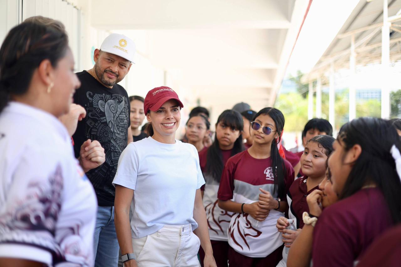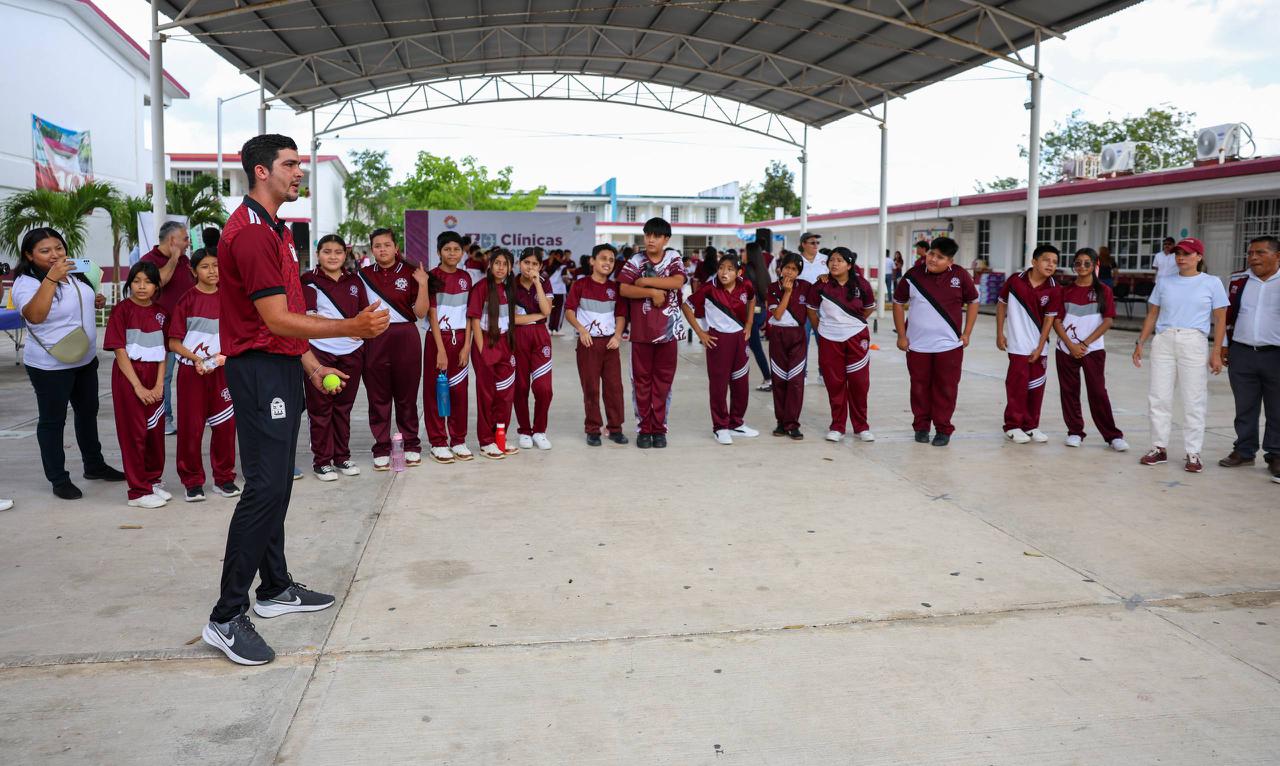 Cancún, Q. R., a 17 de abril de 2026.- Con el objetivo de motivar, inspirar y descubrir el talento deportivo entre la niñez y la juventud cancunense, así como evitar que caigan en actitudes autodestructivas, la Presidenta Municipal, Ana Paty Peralta, puso en marcha el programa “Clínica Deportiva en tu Escuela”, que visitó a las y los estudiantes de la escuela Secundaria Técnica número 38 “Carmen Serdán” en la Supermanzana 260.
