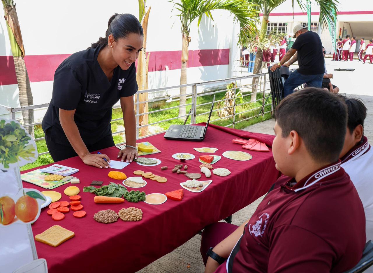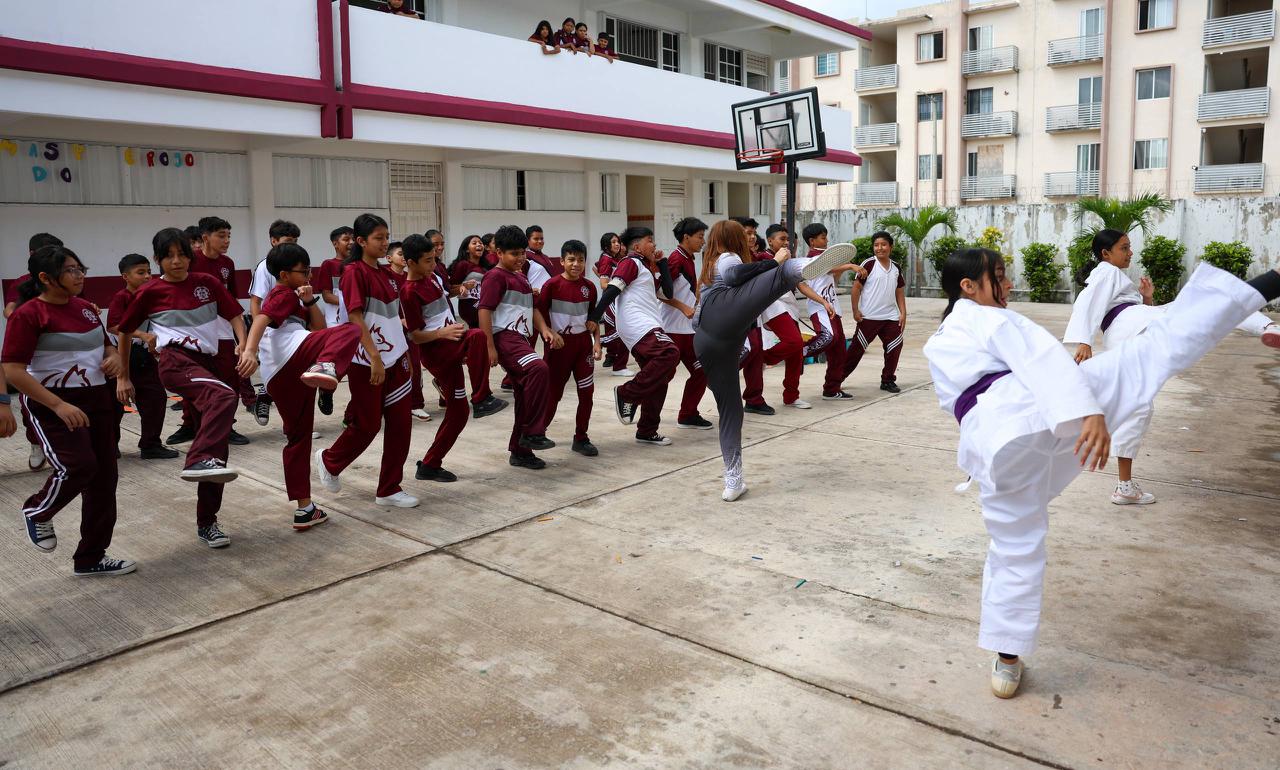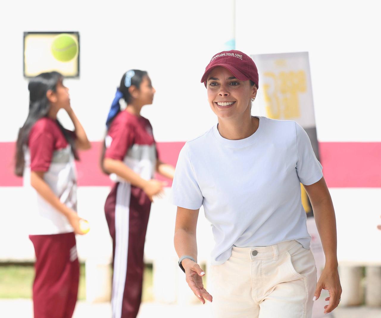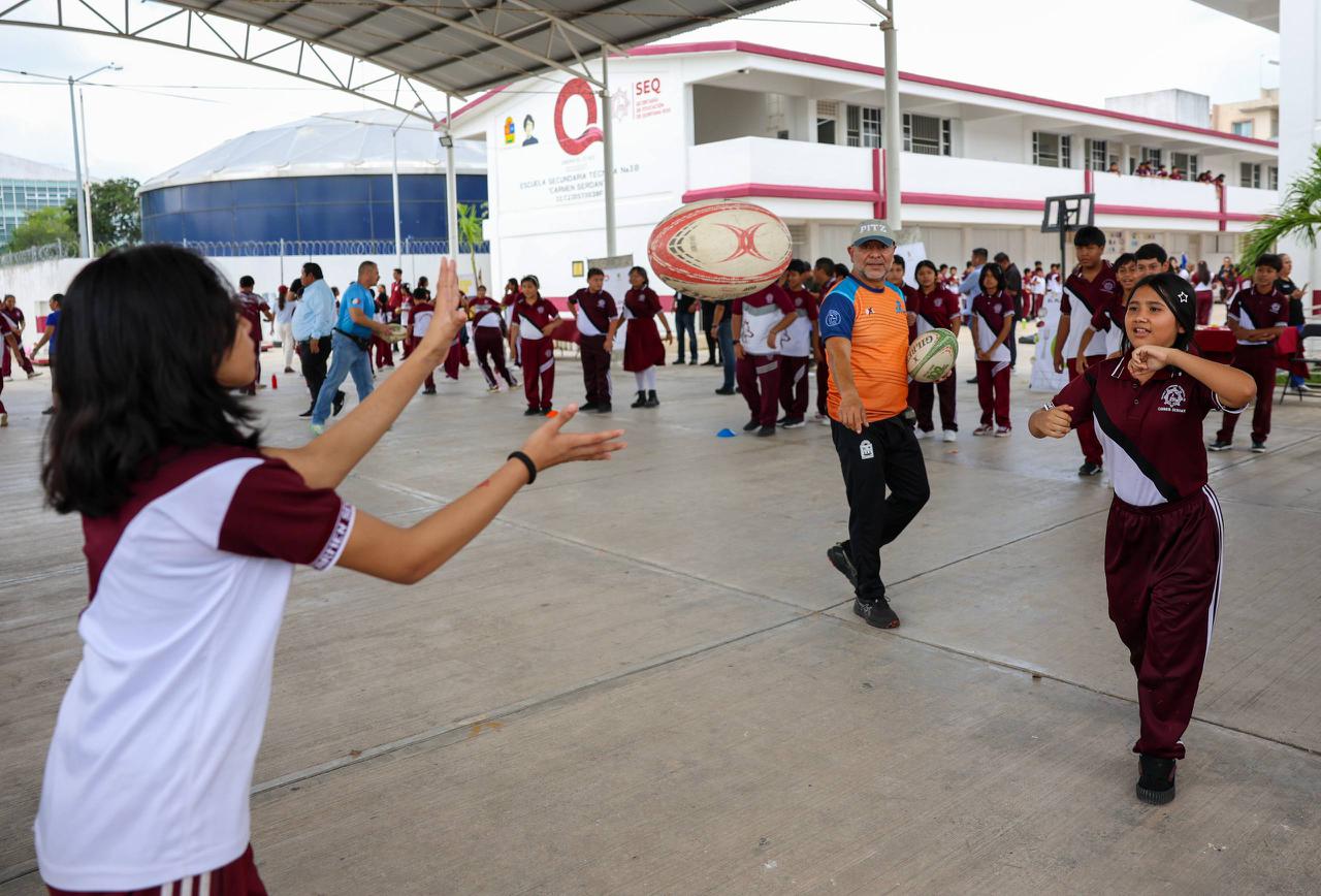 Cancún, Q. R., a 17 de abril de 2026.- Con el objetivo de motivar, inspirar y descubrir el talento deportivo entre la niñez y la juventud cancunense, así como evitar que caigan en actitudes autodestructivas, la Presidenta Municipal, Ana Paty Peralta, puso en marcha el programa “Clínica Deportiva en tu Escuela”, que visitó a las y los estudiantes de la escuela Secundaria Técnica número 38 “Carmen Serdán” en la Supermanzana 260.