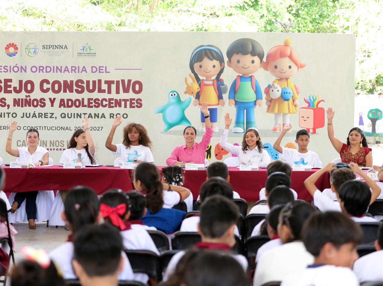 Cancún, Q. R., a 21 de abril de 2026.- Con el fin de impulsar la participación activa, incluyente, cercana y significativa de las niñas, niños y adolescentes del municipio, por primera vez se realizó fuera del Ayuntamiento de Benito Juárez, la Tercera Sesión Ordinaria del Consejo Consultivo de Niñas, Niños y Adolescentes de Benito Juárez, período 2024-2027, encabezada por Presidenta Municipal, Ana Paty Peralta, y teniendo como sede el Domo de la Escuela Primaria “Mario Pantoja Méndez”.