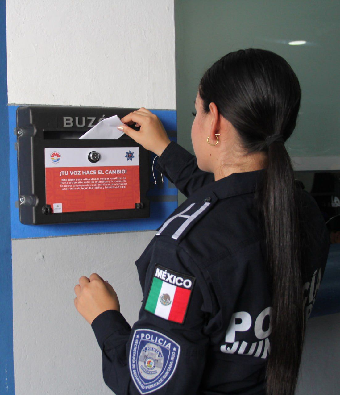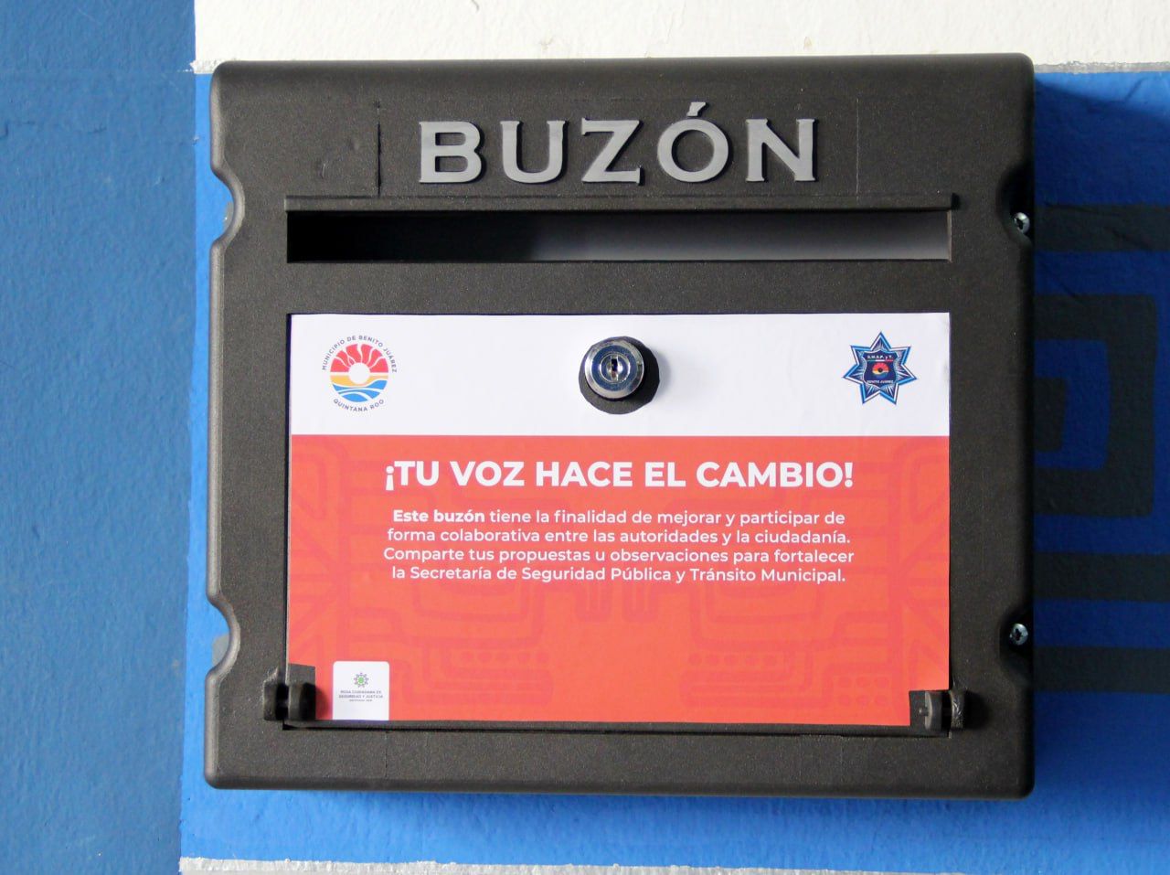 Los buzones tienen la leyenda “¡Tu voz hace el cambio! Este buzón tiene la finalidad de mejorar y participar de forma colaborativa entre autoridades y la ciudadanía. Comparte tus propuestas u observaciones para fortalecer la Secretaría de Seguridad Pública y Tránsito Municipal”.
