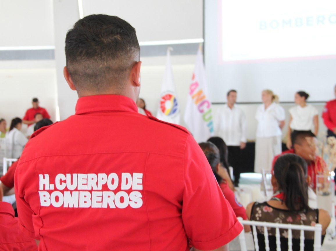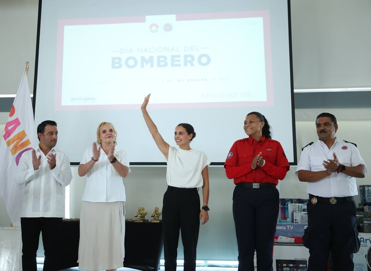 Conmovida por observar a una niña vestida con el uniforme de bombero, la Primera Autoridad se acercó para decirles a las y los hijos de los bomberos, que deben sentirse orgullosos del desempeño de sus papás, quienes son los héroes sin capa de Cancún.