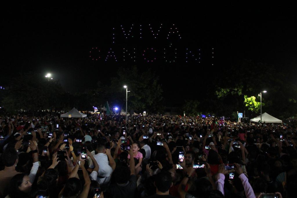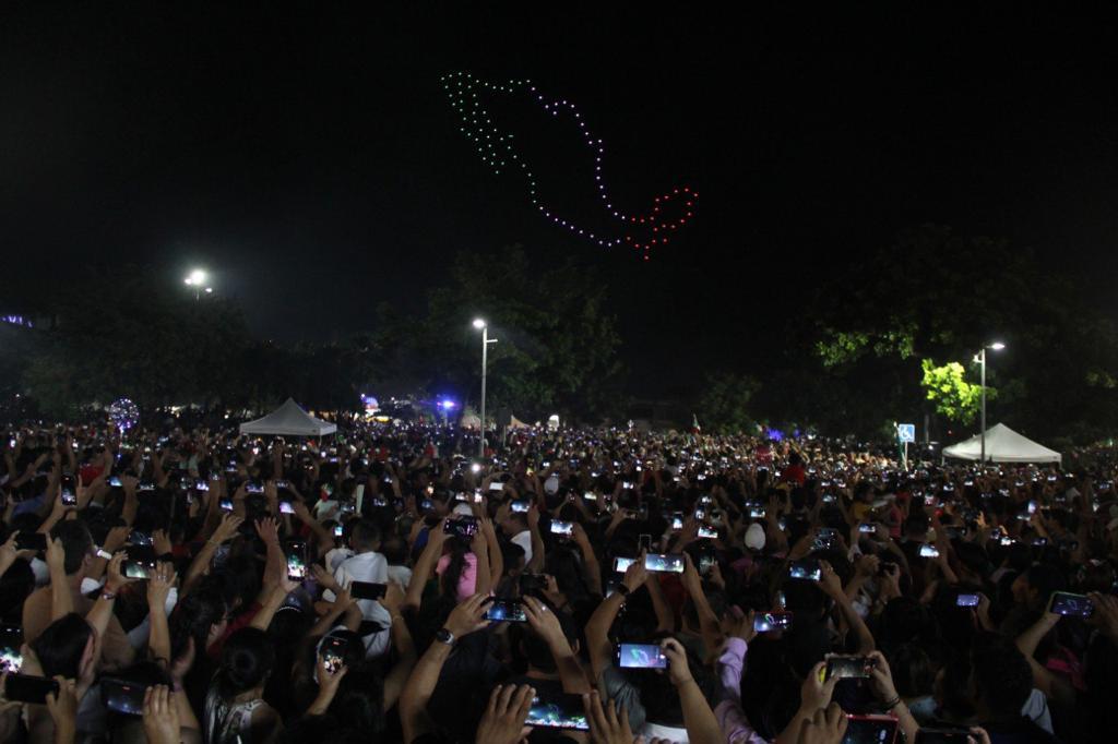 De esta forma, comenzó la verbena popular en la que los miles de ciudadanos que arroparon a la Primera Edil en la celebración, disfrutaron de los drones, los cuales se iban alineando con precisión en el cielo para formar diferentes figuras características como la Bandera de México, la campana de Dolores, la silueta de la República Mexicana, así como el escudo del municipio y la leyenda: “Cancún nos une”, entre otros.