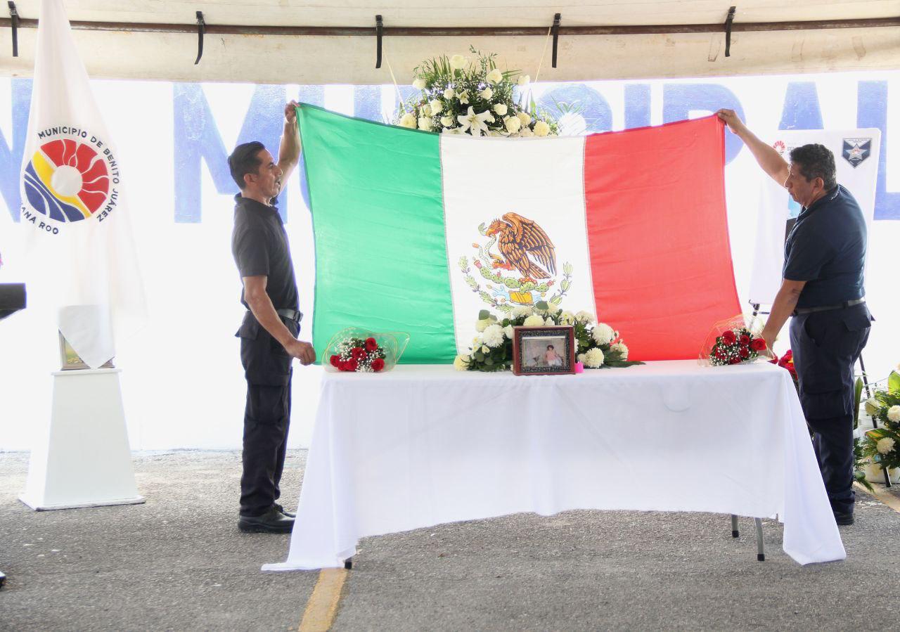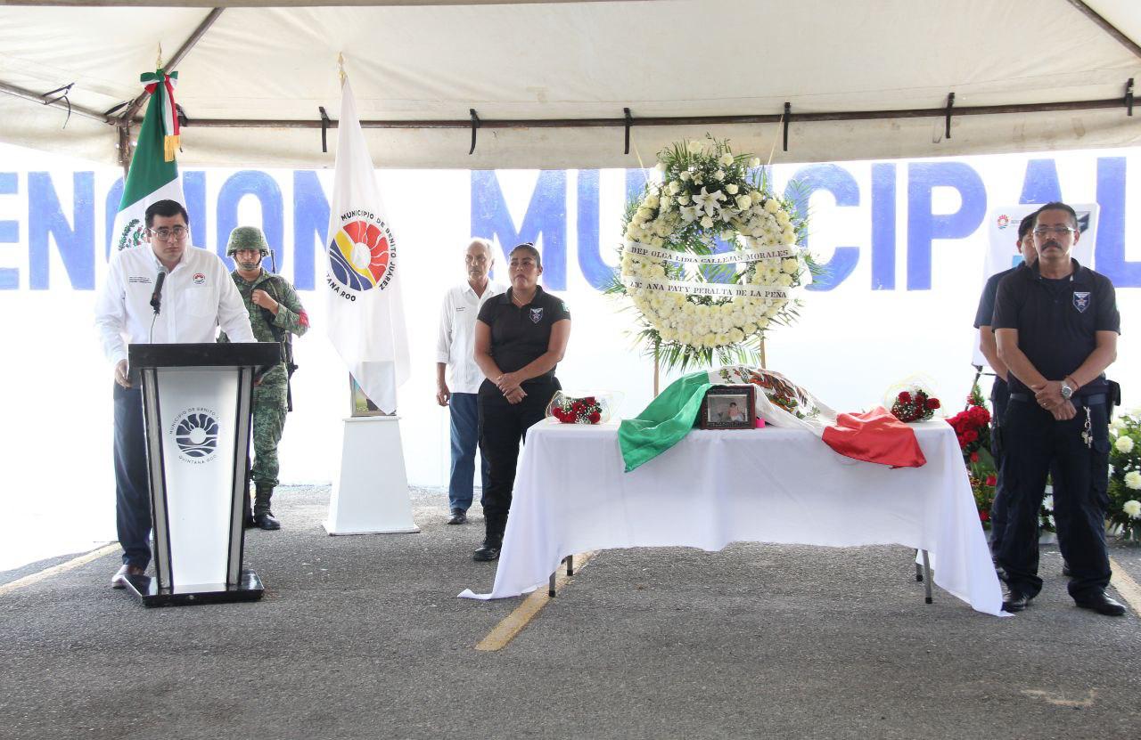 Cancún, Q. R., a 22 de septiembre de 2023.- Con una distinguida ceremonia luctuosa, el director del Centro de Retención y Sanciones Administrativas, Miguel Arturo Moisés Martínez, en representación de la Presidenta Municipal, Ana Paty Peralta; personal de la Secretaría de Seguridad Pública y Tránsito, y familiares de la custodia Olga Lidia Morales Callejas, despidieron con honores fúnebres a dicho elemento, quien perdió la vida el pasado miércoles 20 de septiembre.