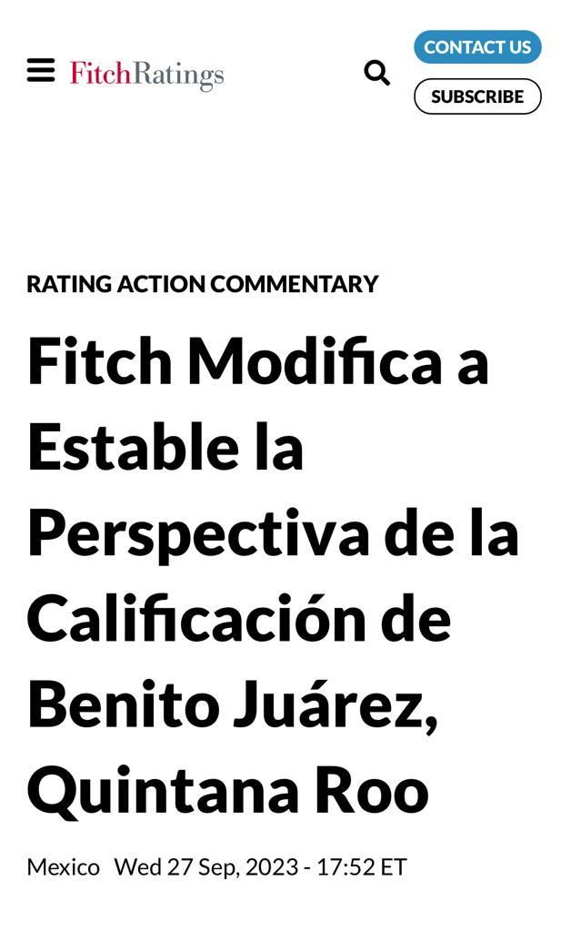 Cancún, Q. R., a 28 de septiembre de 2023.- “Tenemos muy buena recaudación y un gasto bien programado, vamos bien en nuestras finanzas y se está ejerciendo el recurso de manera más eficiente”, afirmó la Presidenta Municipal, Ana Paty Peralta, al dar a conocer la modificación a Estable que hizo Fitch Ratings en la perspectiva de la calificación nacional de largo plazo y ratificar la valoración de ´A+(mex) para el municipio de Benito Juárez.