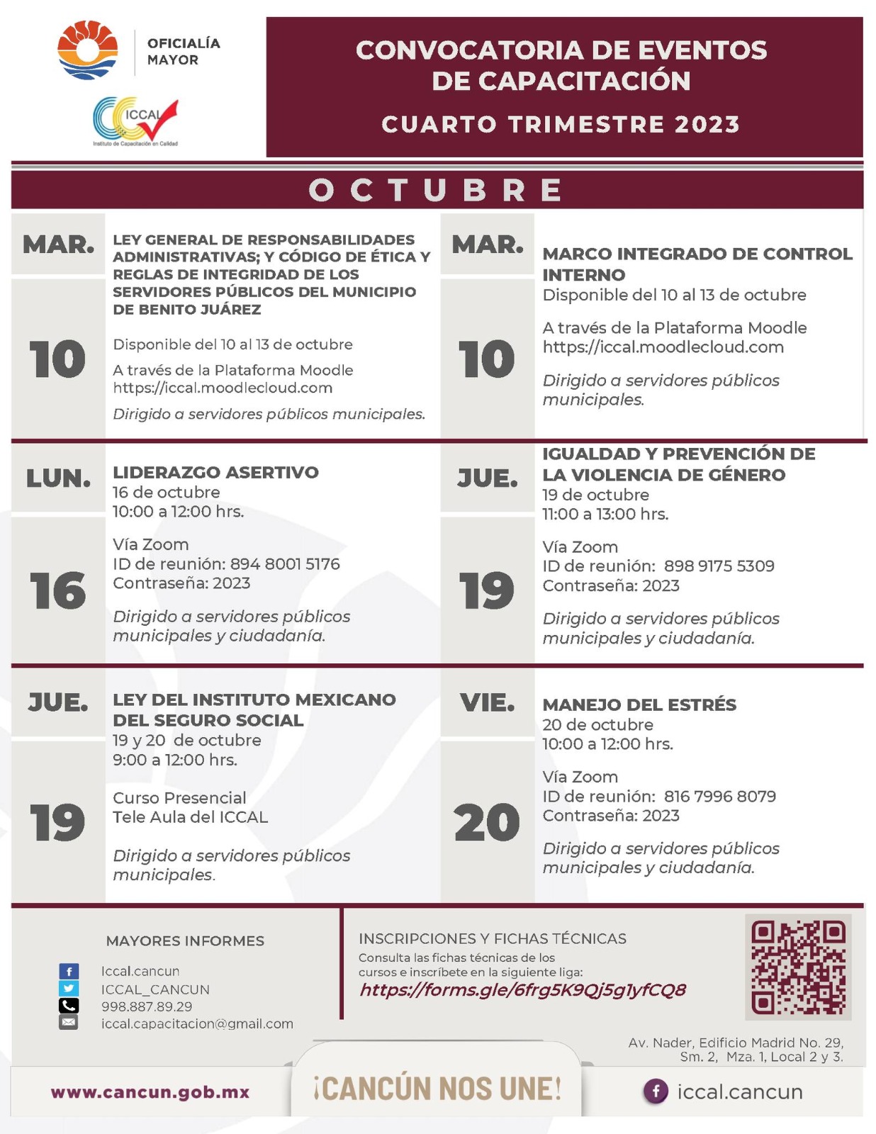 Cancún, Q. R., a 10 de octubre de 2023.- En la primera parte de octubre, el Instituto de Capacitación en Calidad (ICCAL) del Ayuntamiento de Benito Juárez contará con seis cursos gratuitos tanto para servidores públicos como para la ciudadanía en general para temas inherentes a la administración pública y habilidades para el trabajo.