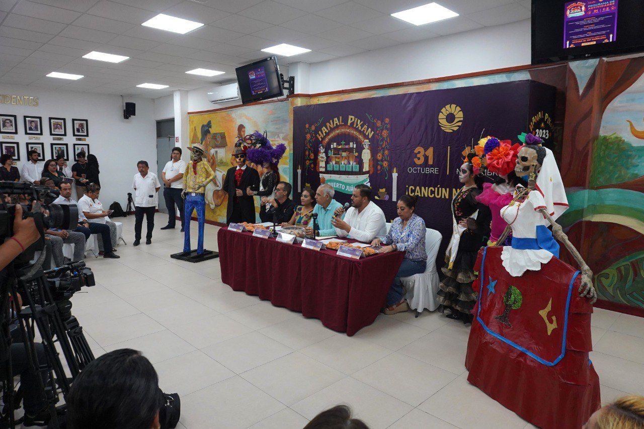 Cancún, Q. R., a 16 de octubre de 2023.- En conferencia de prensa, autoridades municipales dieron a conocer el programa cultural, artístico y gastronómico de la tercera edición del “Hanal Pixán 2023”, el cual se ha convertido en una tradición para Cancún, y parte de las raíces mexicanas donde se conmemora a los fieles difuntos en el marco del Día de Muertos, que además será a beneficio del Sistema para el Desarrollo Integral de la Familia (DIF) Benito Juárez.