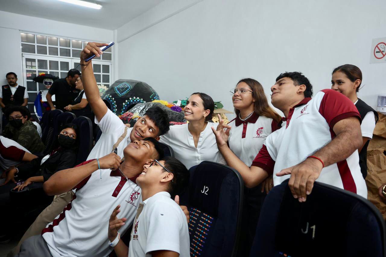 Cancún, Q. R., a 29 de mayo de 2023.- Al presenciar una plática de capacitación del programa “Jornadas Juveniles” en el CBTIS 272 de la Supermanzana 255, la Presidenta Municipal, Ana Paty Peralta, convivió con jóvenes de bachillerato técnico de quinto y sexto semestre, próximos a graduarse, a quienes exhortó a continuar sus estudios profesionales, estudiar una carrera y concluirla, lo que pueden combinar y balancear en caso de empezar a trabajar, pero siempre capacitándose para dar lo mejor de sí.