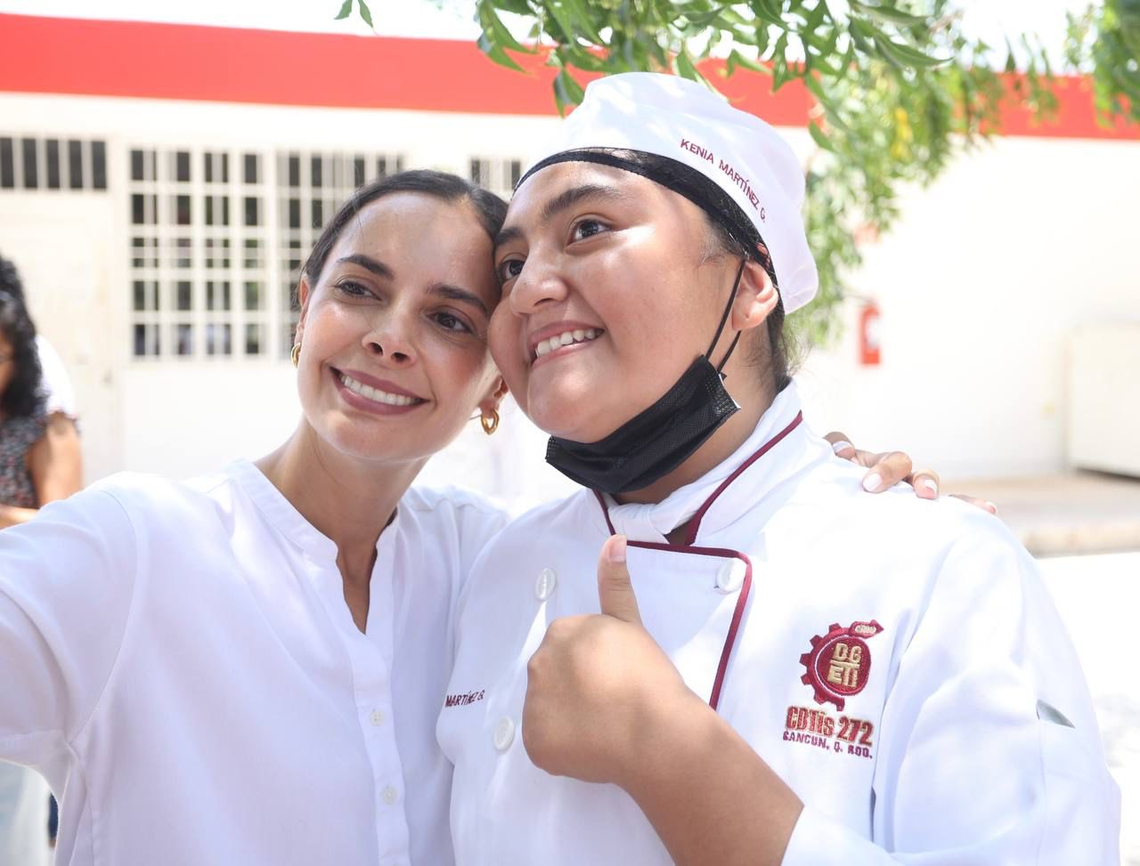Para conocer un poco de lo que aprenden en ese plantel, la Presidenta Municipal pasó a saludar a los alumnos de cuarto semestre que estaban en el taller de Alimentos y Bebidas en una práctica de elaboración de postres correspondiente a un brownie y un pay de limón, y contentos de tenerla cercana a ellos, los estudiantes la invitaron a presenciar el concurso Copa Chef 2023 el próximo 1° de junio, en el que participarán junto con todos los CBTIS de Quintana Roo.