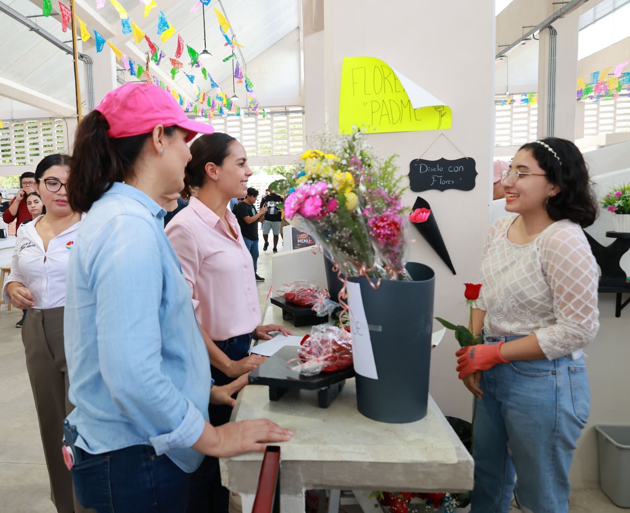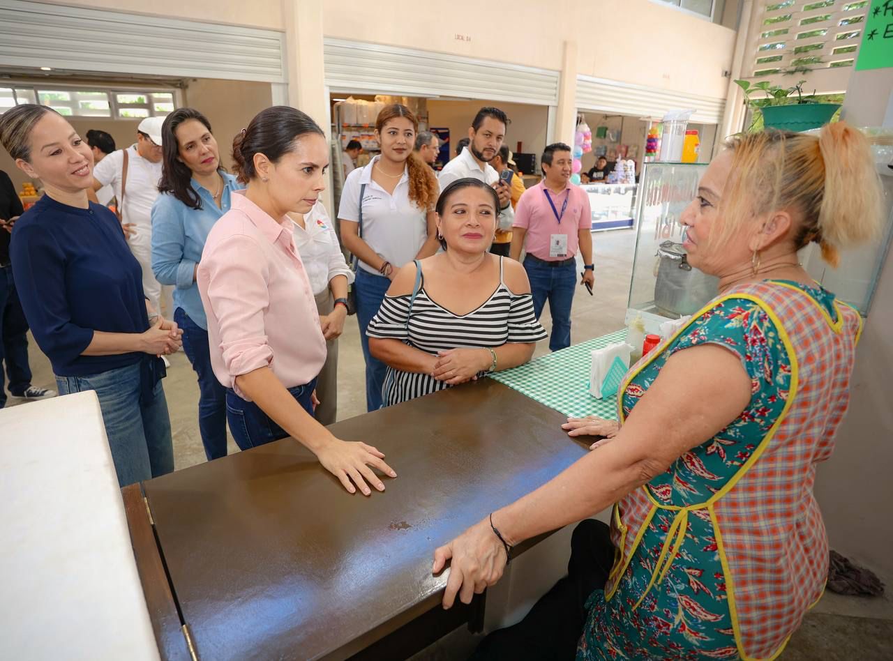 De los 61 locales, precisó, 55 se encuentran abiertos ofertando jugos y licuados, dulcería, artesanías, novedades, venta de ropa, jarcería, cremería, tecnología, electrodomésticos, papelería, alimentos preparados y florería. Durante su visita, uno de los locatarios obsequió a la Alcaldesa una rosa roja en agradecimiento por el apoyo a la economía de sus familias.
