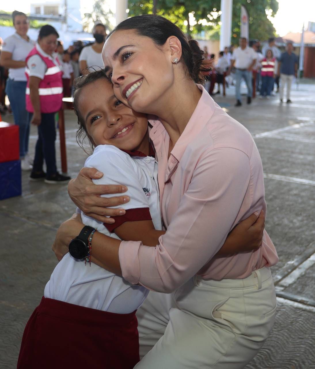 Al ser recibida por diversas autoridades y alumnos de la institución educativa, la Primera Autoridad Municipal reafirmó que la niñez benitojuarenses es prioridad para su administración, y les explicó que la escuela es un lugar para aprender, convivir y divertirse, por lo que les pidió que entre ellos se cuiden, se respeten, protejan y quieran.