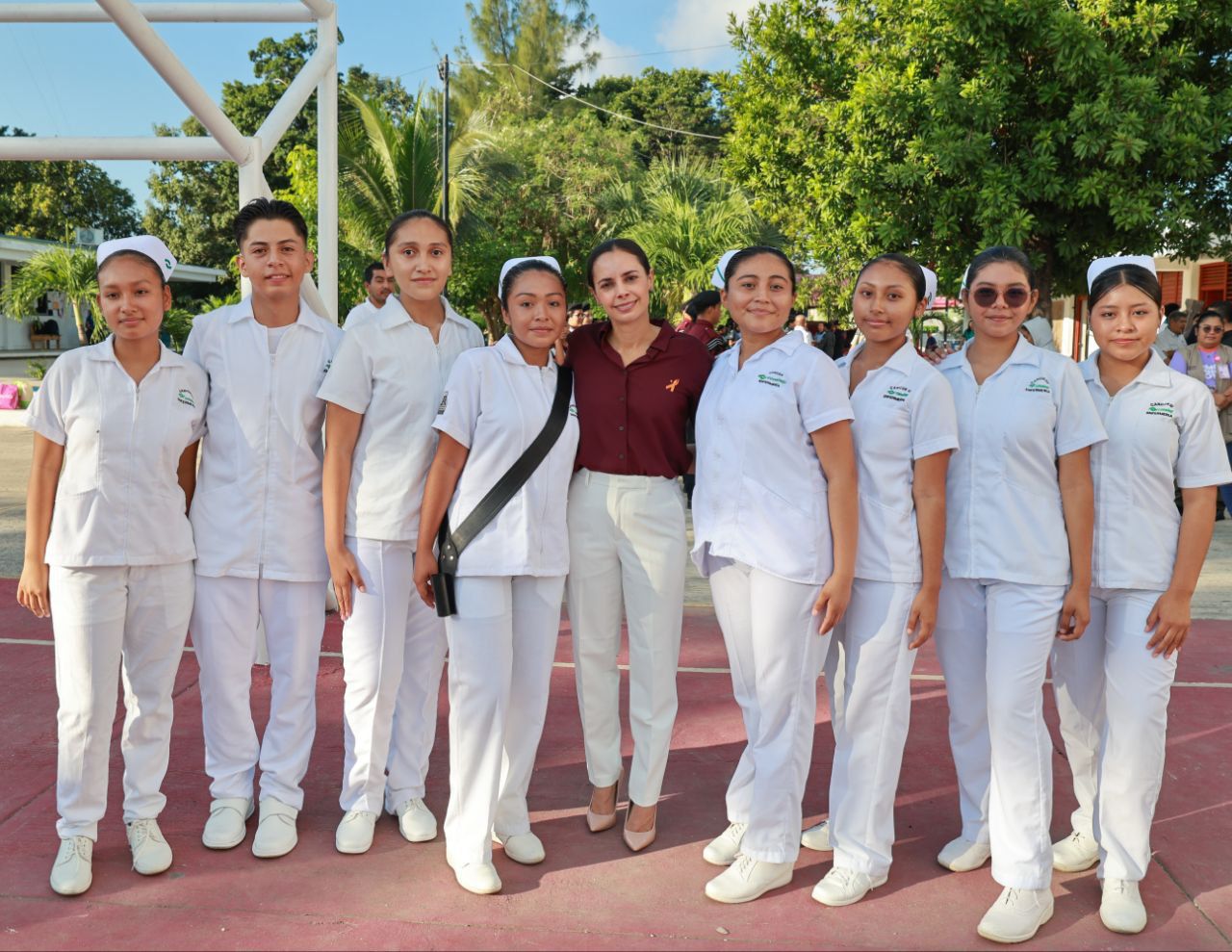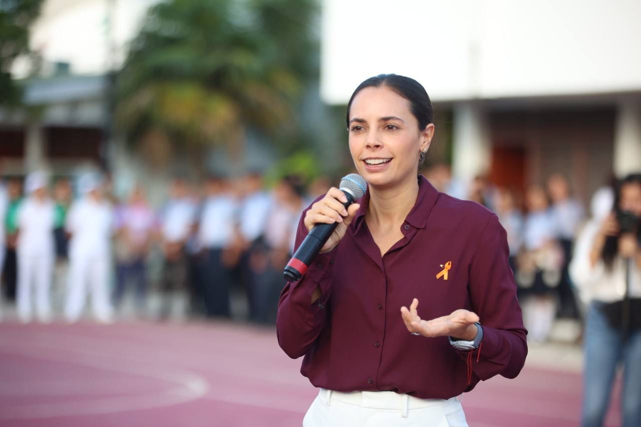 Al concluir la ceremonia cívica, que estuvo amenizada por la Banda de Música del Ayuntamiento y con la participación de la banda de guerra y escolta del plantel, Ana Paty Peralta prosiguió a plasmar su huella en la inauguración del “Lazo de la sororidad”, que elaboraron los alumnos a fin de conmemorar el 25 de noviembre, el Día Internacional de la Eliminación de la Violencia contra la Mujer.