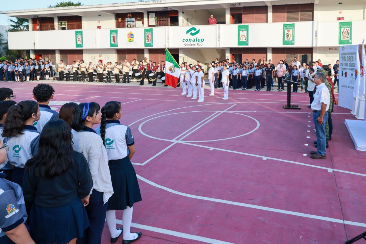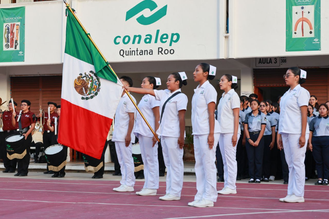 Cancún, Q. R., a 24 de noviembre de 2023.- En el marco del 121 Aniversario de la Creación del Territorio de Quintana Roo, la Presidenta Municipal de Benito Juárez, Ana Paty Peralta, resaltó el liderazgo de las juventudes en el estado y alentó a contribuir en la construcción de una sociedad próspera, al encabezar una ceremonia cívica realizada en el Colegio Nacional de Educación Profesional Técnica (CONALEP) III, en la Supermanzana 253.