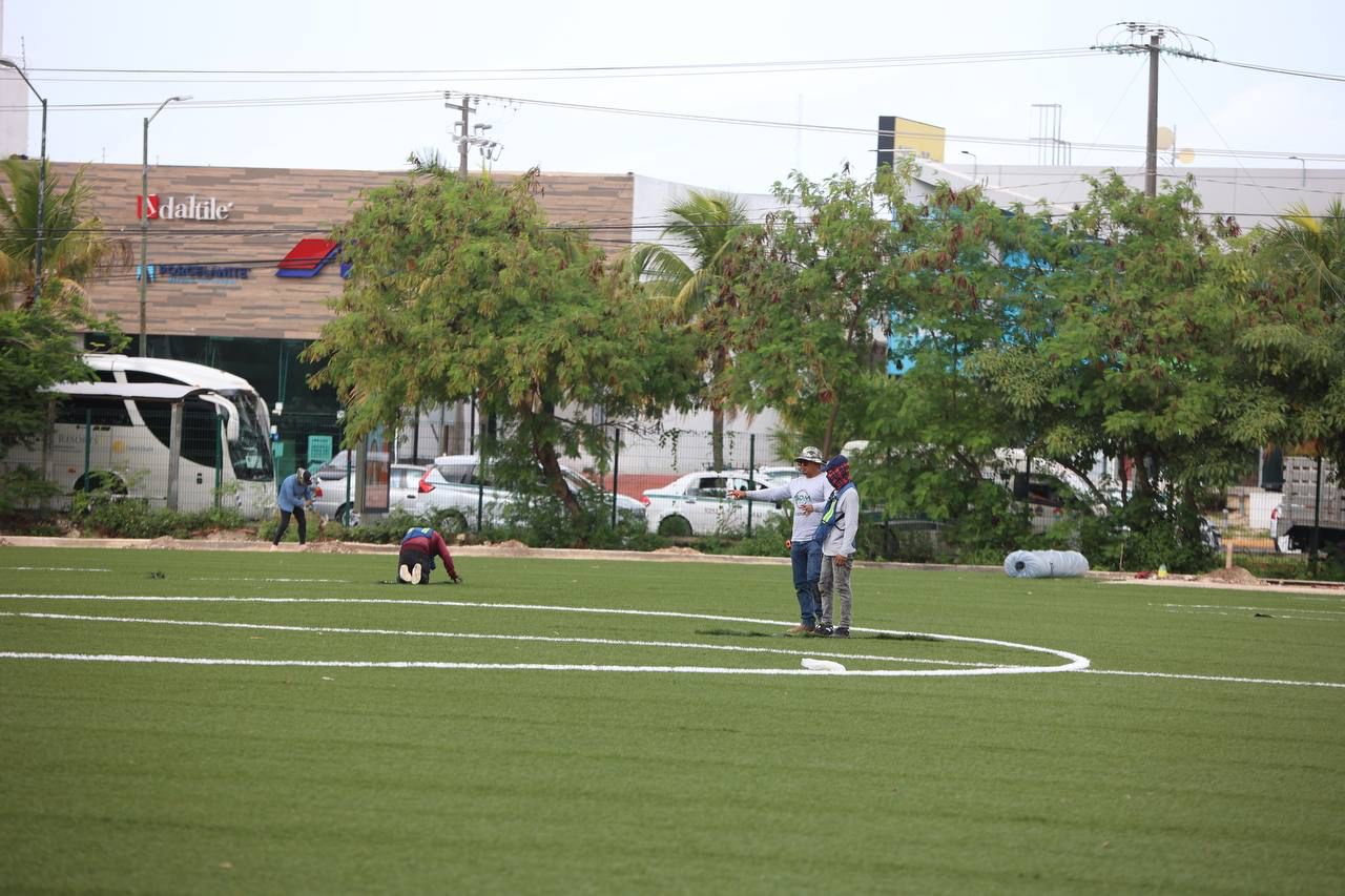 De igual forma, detalló que con el apoyo de 36 trabajadores en total, también se continúa con el injerto de líneas delimitadoras de los espacios de juego, además de que se coloca las pequeñas estructuras de concreto en las que se fijarán los postes para el cercado de protección a la zona.