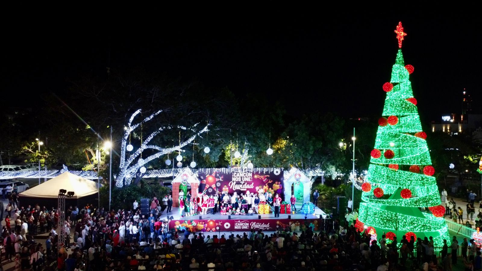 Como segundo evento después de un concierto por parte de la Banda de Música del Ayuntamiento y coros navideños, ambas autoridades y decenas de cancunenses vivieron otro momento lleno de magia y alegría al contar desde 10 a 0 para ver prendidos miles de foquitos en el edificio central y fachada del Palacio Municipal, los pasillos laterales con cielos iluminados, el nacimiento, el portal navideño, las nochebuenas, las esferas, las botas navideñas, los árboles y sobre todo el tradicional árbol navideño en la Plaza de la Reforma.