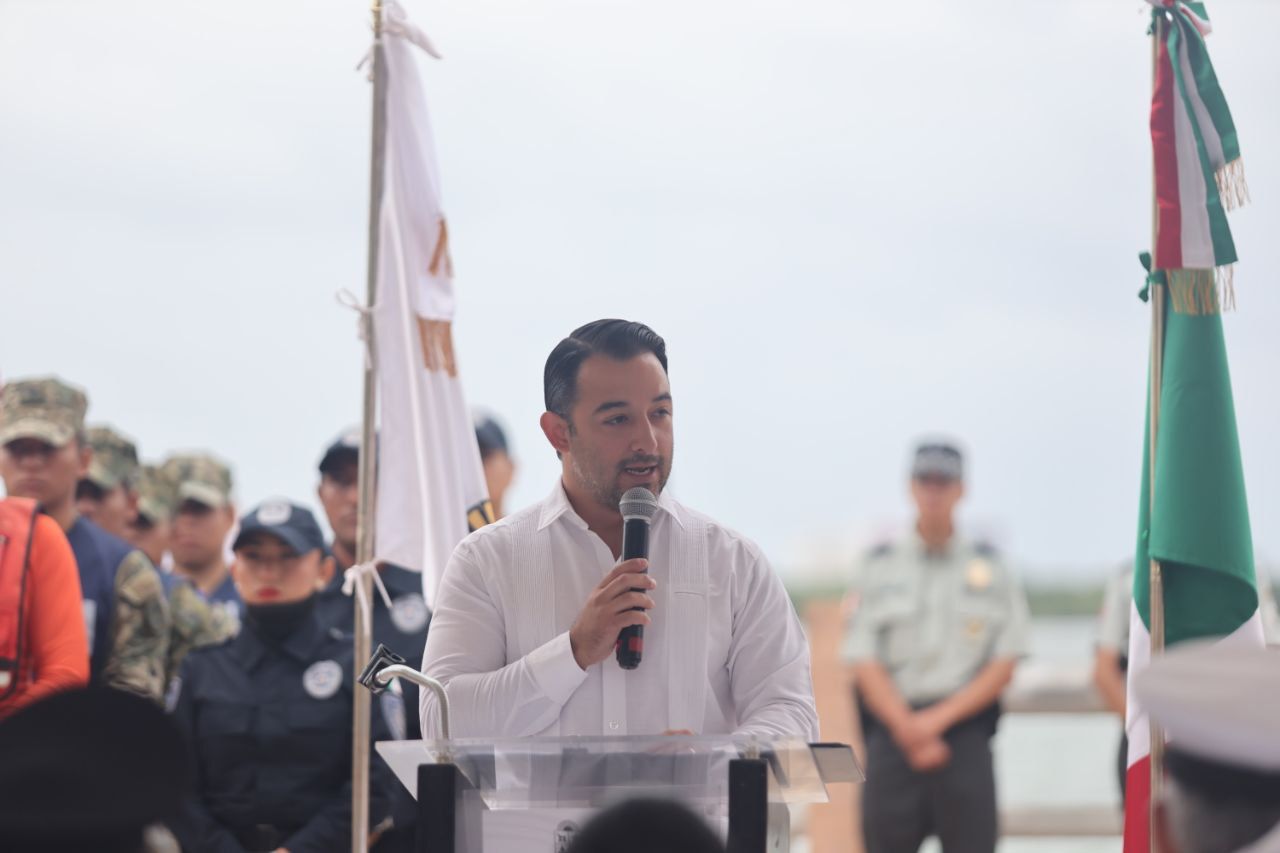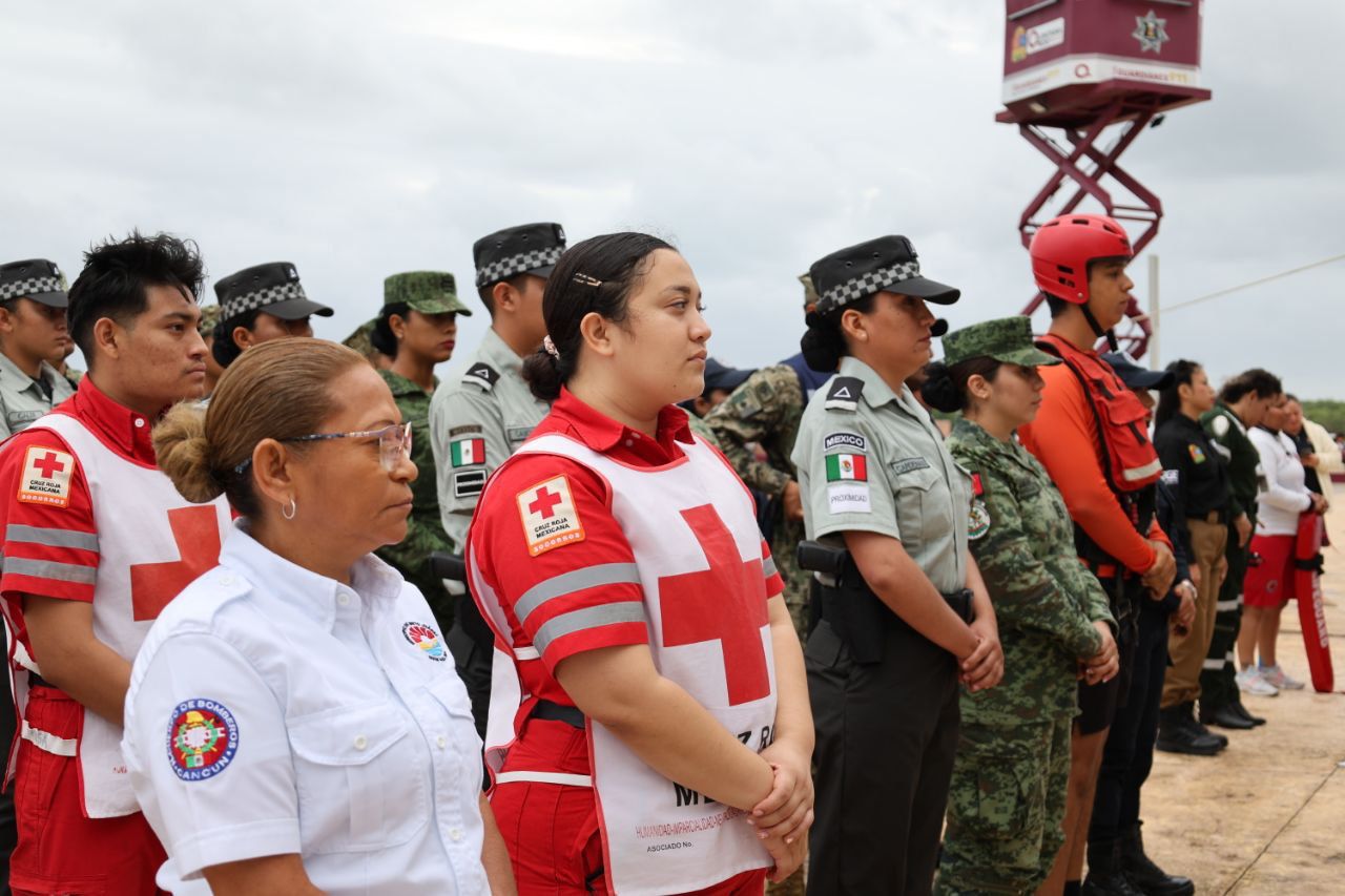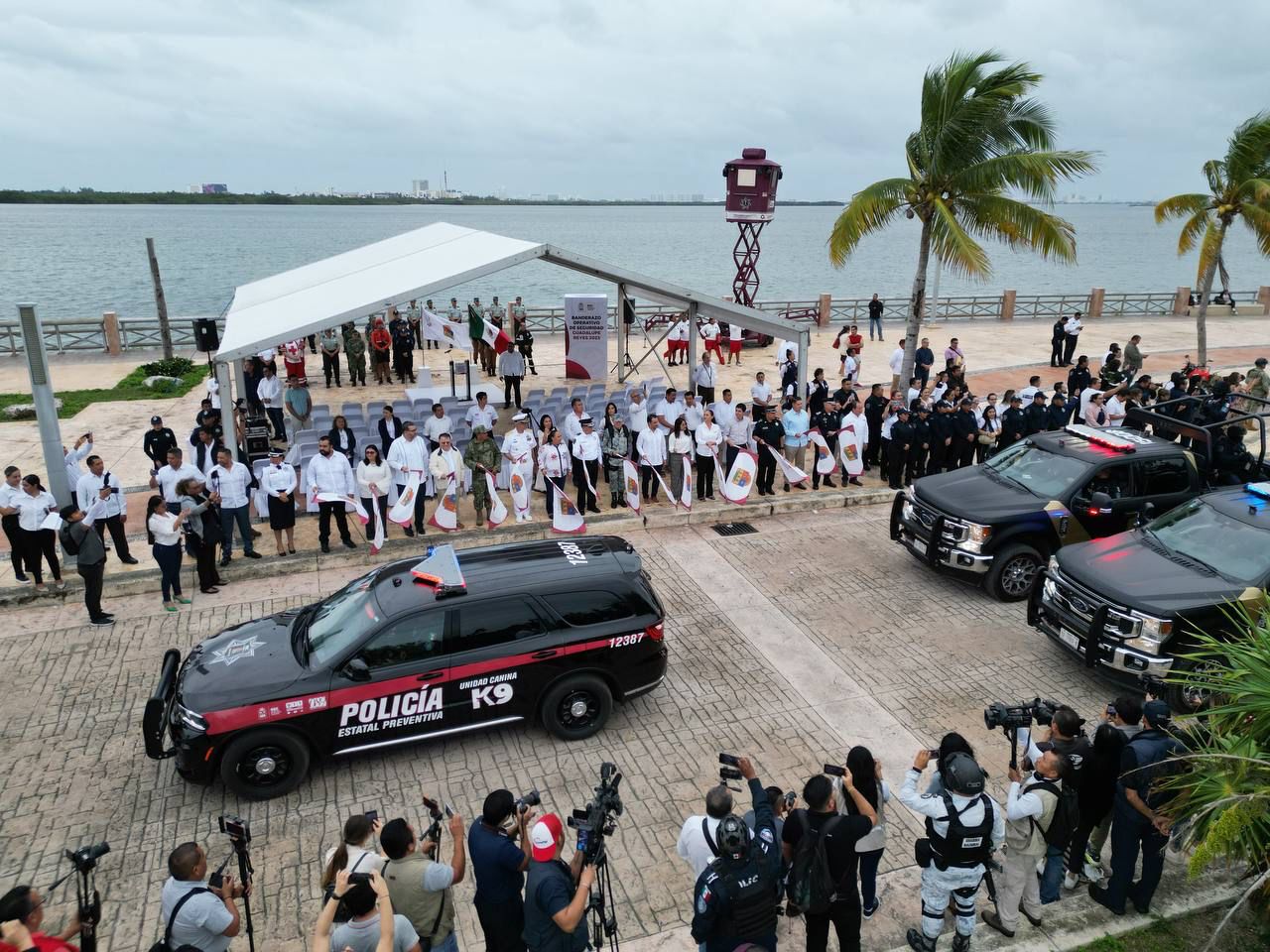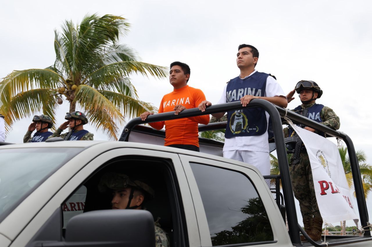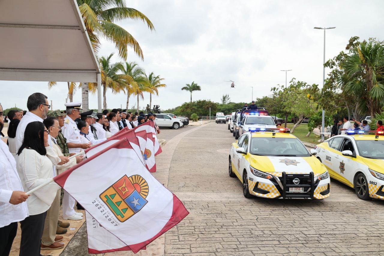 Posteriormente, se realizó un desfile de presentación de los elementos del Plan Marina de la Secretaría de la Defensa Nacional (Sedena), Guardia Nacional, Instituto Nacional de Migración, Ángeles Verdes, Policía de Investigación de la Fiscalía General del Estado (FGE), Policía Estatal Preventiva, y el grupo “Itzama” con drones de vigilancia de la Secretaría Ciudadana del estado de Quintana Roo.