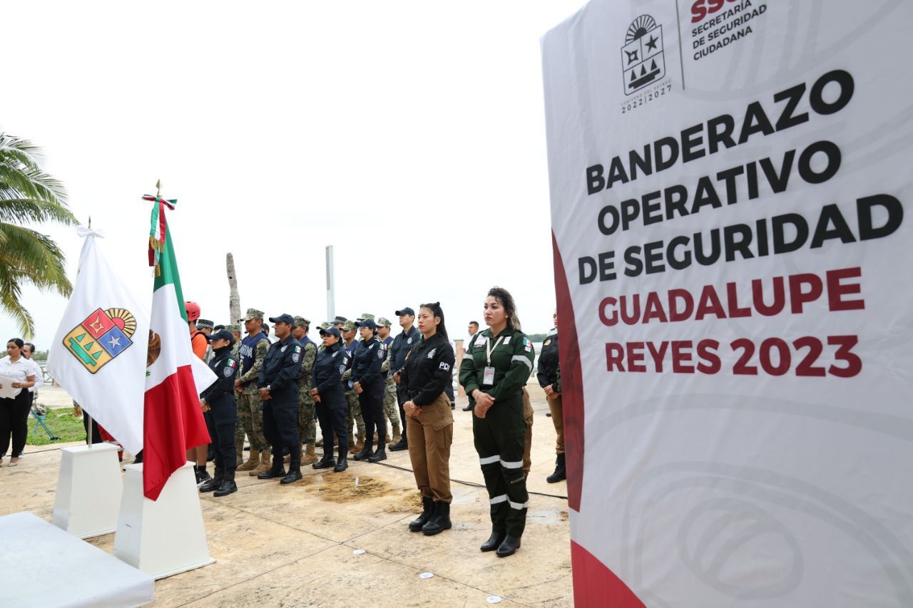 Cancún, Q. R., a 11 de diciembre de 2023.- Con un estado de fuerza de más de 6 mil elementos operativos de diversas corporaciones, dio inicio el “Operativo de Seguridad Guadalupe – Reyes”, con el banderazo de salida encabezado por autoridades de los tres órdenes de gobierno, con el objetivo de salvaguardar la integridad física de turistas y locales durante la temporada decembrina.