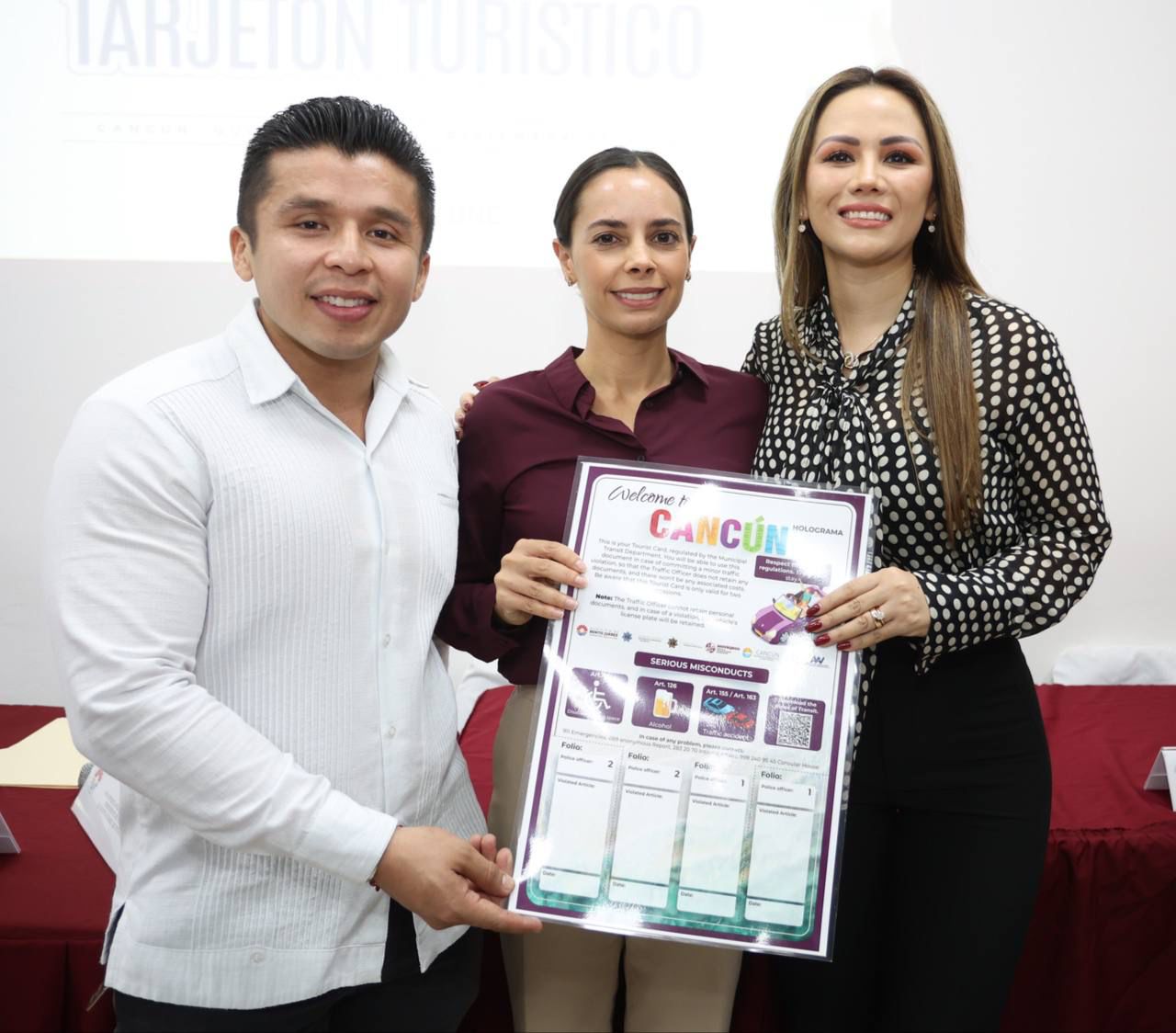 Cancún, Q. R., a 20 de diciembre de 2023.- Con el fin de otorgar seguridad a los turistas nacionales y extranjeros que transitan en Cancún, la Presidenta Municipal, Ana Paty Peralta, presentó el tarjetón turístico que regresa a Benito Juárez después de nueve años de su primera emisión, para uso de viajeros que cometan infracciones de tránsito consideradas no graves.