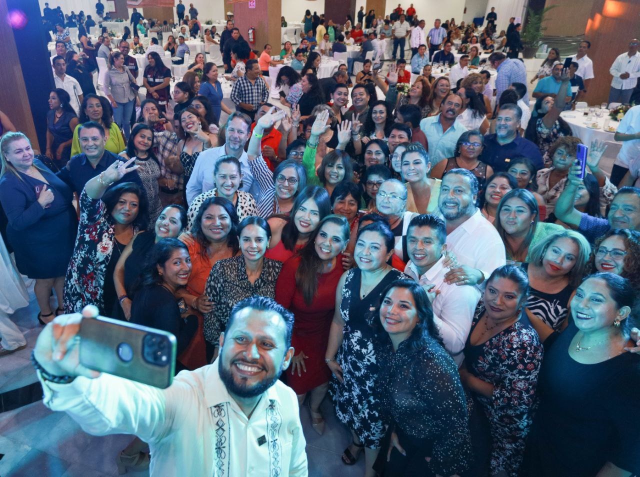 Ana Paty Peralta, durante la cena conmemorativa convivió y sonrió con las y los celebrados, quienes compartieron momentos de calidad con autoridades de los tres órdenes de gobierno, recordándoles que los festejos son por su ardua labor y amor por la enseñanza.