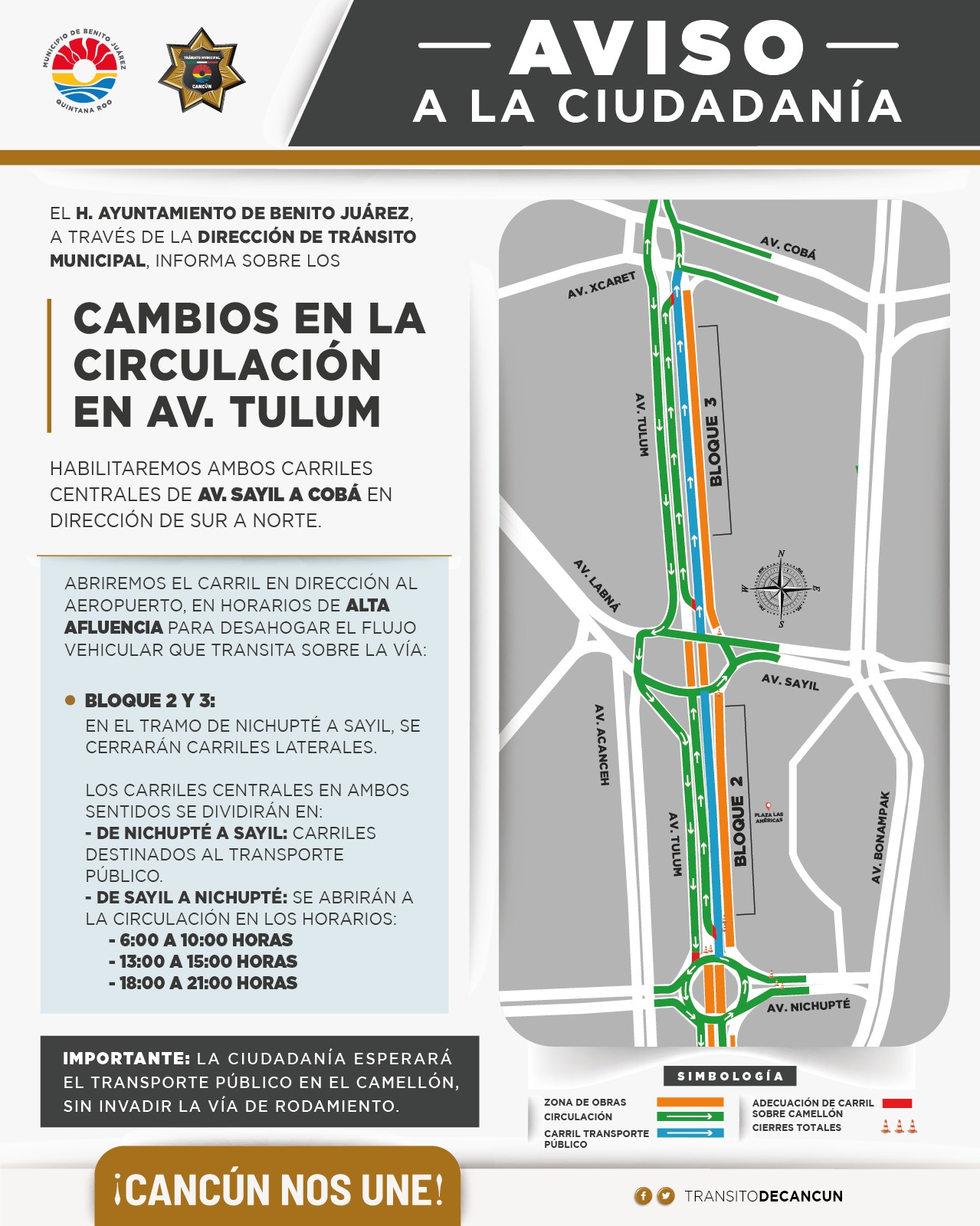 en la circulación vial en la avenida Tulum, dónde se habilitarán ambos carriles