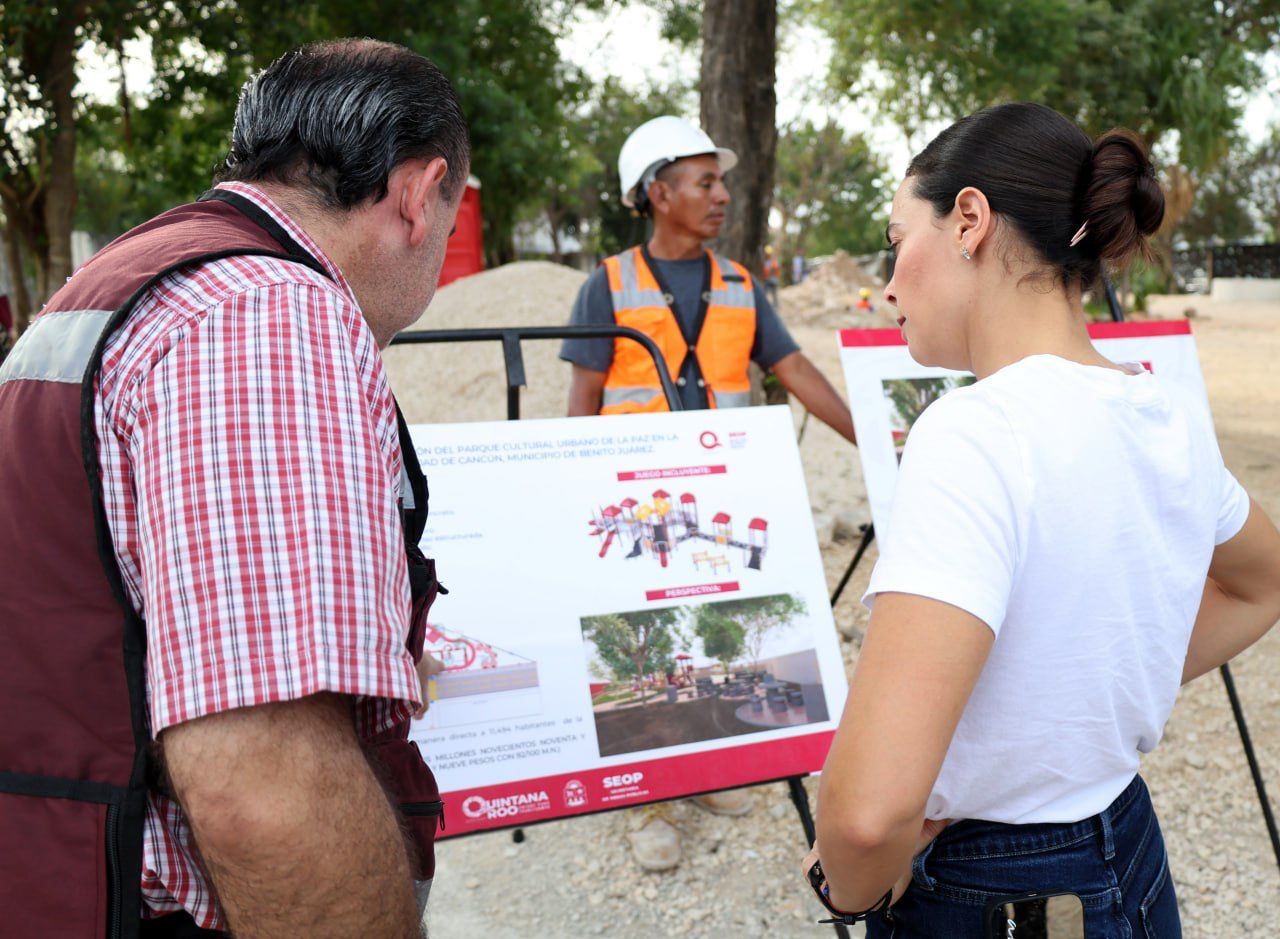 Cancún, Q.R., a 09 de enero de 2024.- A fin de ofrecer mejores espacios de recreación a la ciudadanía para promover la cohesión social, fomentar la creatividad, la unión familiar y mejorar la calidad de vida de los mismos, autoridades municipales y estatales realizaron un recorrido para supervisar el avance del Parque Cultural Urbano de la Paz, ubicado en la Supermanzana 259.