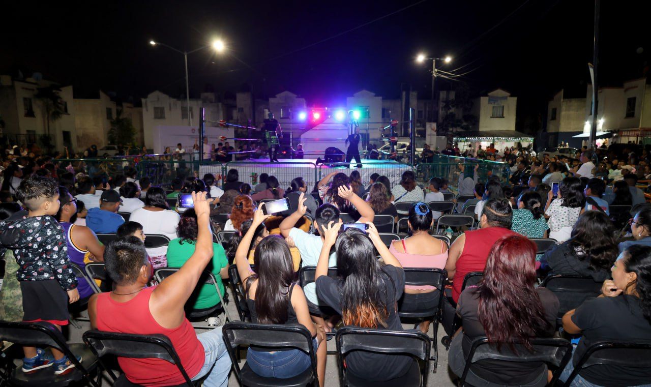 Cancún, Q. R., a 21 de enero de 2024- Con la finalidad de recomponer el tejido social a través de la cultura de la actividad física y el sano esparcimiento, el Ayuntamiento de Benito Juárez, por medio del Instituto del Deporte, celebró la noche de este sábado el arranque de “Tardes de Lucha Libre” en el estacionamiento de la manzana 104, en la Supermanzana 259, Villas Otoch Paraíso.