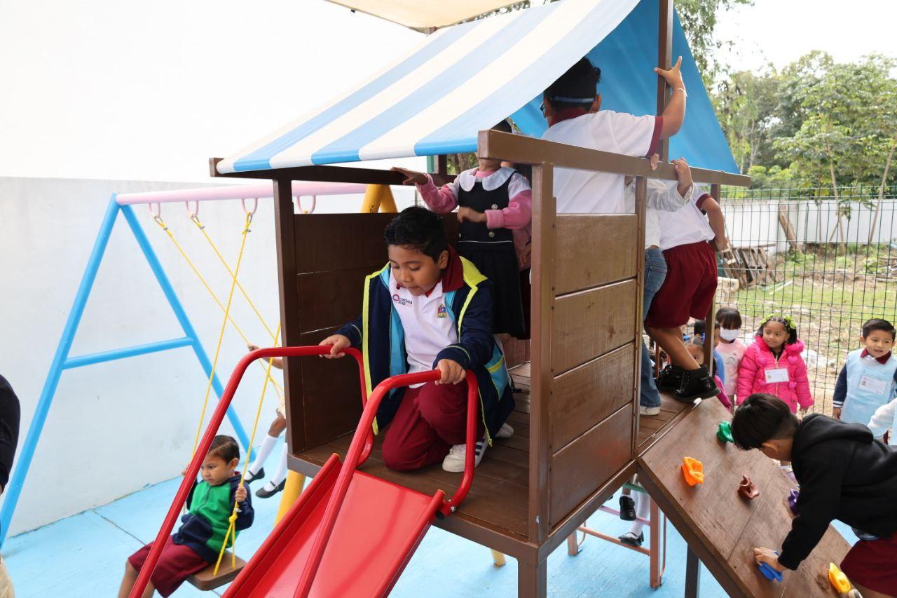 Cancún, Q. R., a 30 de enero de 2024.- A fin de dar mejor espacio de recreación para los alumnos del Jardín de niños Myriam Nemirovsky, en el Fraccionamiento Cielo Nuevo de la Supermanzana 251, autoridades municipales participaron en la inauguración del área de juegos “Rincón de la Alegría”, construida bajo el programa federal “La Escuela es Nuestra” en dicho plantel, donde además llevaron a cabo una edición del programa Jornada Municipal “Valores y Cultura Cívica”.