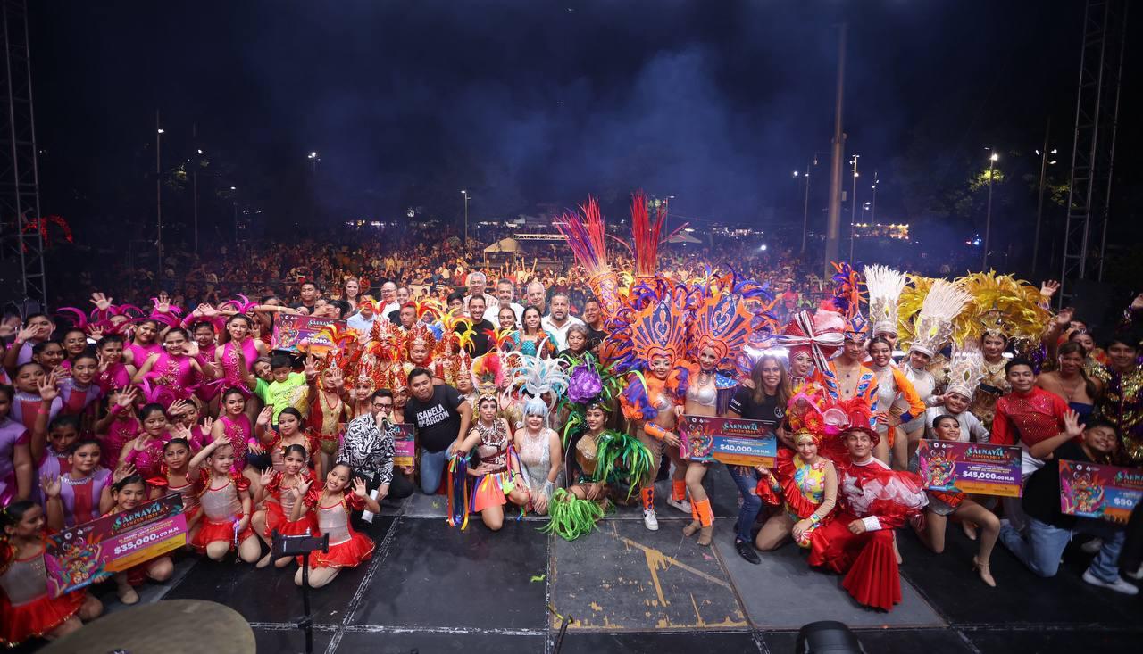 Además, para enmarcar esta actividad llena de alegría, la Primera Autoridad Municipal, junto al titular del Instituto Municipal de la Cultura y las Artes, Carlos López Jiménez, y otras autoridades municipales, entre vítores y aplausos premiaron a las comparsas ganadoras en la categoría infantil, juvenil, libre y a los carros alegóricos.