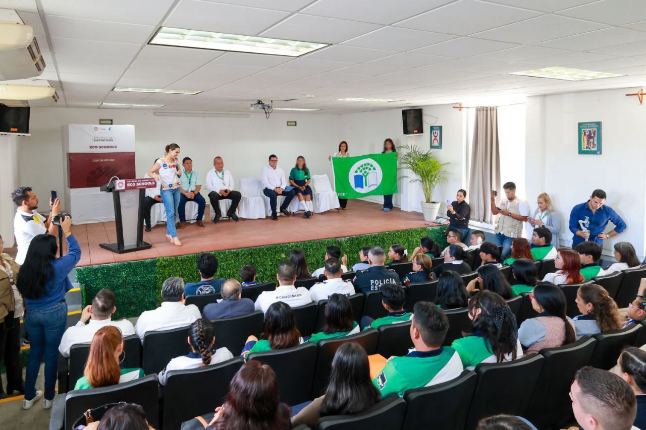 Cancún, Q. R., a 21 de febrero de 2024.- En un trabajo en conjunto entre gobierno e instituciones académicas en pro del medio ambiente, autoridades del Ayuntamiento de Benito Juárez entregaron siete distintivos del programa internacional “Eco-Schools” a escuelas en Cancún, emitidos por la Fundación para la Educación Ambiental (FEE) en México, por mejorar su entorno y protegerlo activamente.