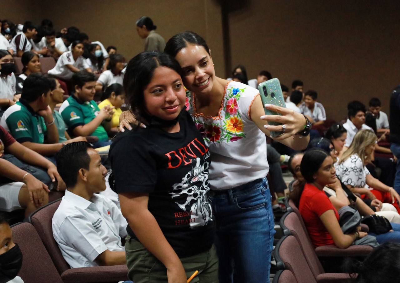 Alrededor de 200 jóvenes becarios de nivel medio superior y superior, recibieron a la Primera Autoridad en el Planetario Cancún Ka’Yok’, quien los saludó emocionada por formar parte del foro social, donde se desarrollaron diferentes temas alusivos a los derechos humanos universales.