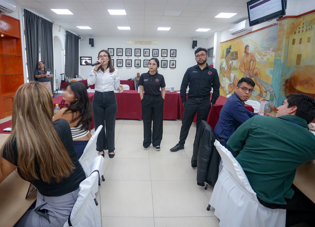 Acompañada por el secretario general del Ayuntamiento, Pablo Gutiérrez Fernández; y la directora de IMJUVE, Danielle Camargo Dávila Madrid; la Primera Autoridad Municipal les platicó sobre el presupuesto histórico que se ha incrementado este año para atender las necesidades de Cancún, al igual que algunas de las muchas acciones en marcha de su gobierno para beneficio de los ciudadanos como: promoción del reciclaje, erradicación de basureros clandestinos, cursos y talleres gratuitos de oficios en los Centros de Desarrollo Comunitario (CDC) para facilitar el autoempleo, caminos de la transformación y cruces seguros, entre otros.