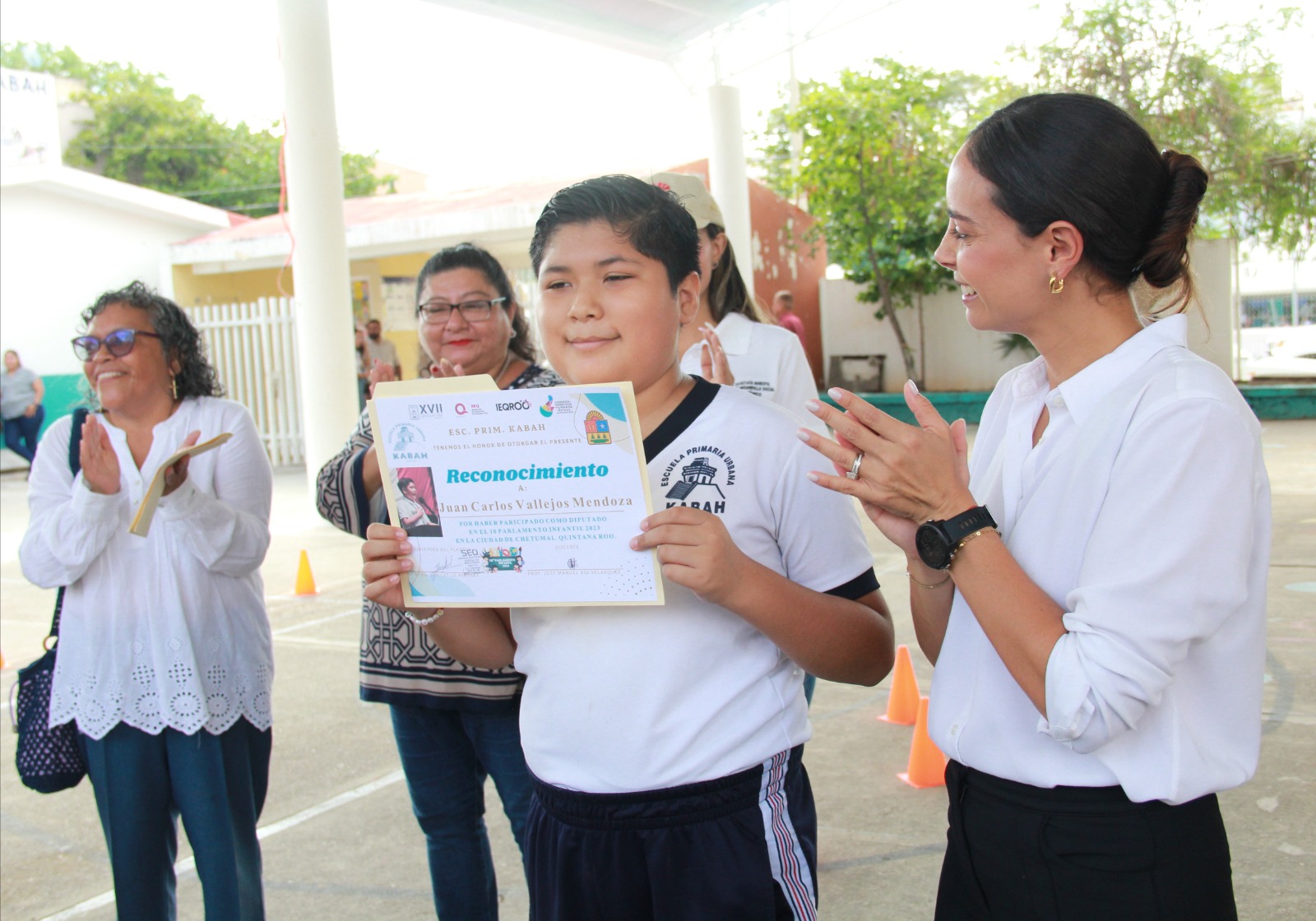 En su recorrido, también visitó y saludó a los alumnos de la escuela primaria “Kabah”, en la cual hizo entrega de un diploma al estudiante Juan Carlos Vallejo Mendoza, por haber participado en el Parlamento Infantil 2023.