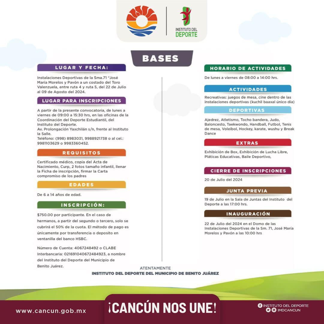 Esta actividad se llevará a cabo del 22 de junio al 09 de agosto de 08:00 a 14:00 horas, en la unidad deportiva de la Supermanzana 71 “José María Morelos” donde los alumnos de entre seis a catorce años podrán disfrutar de 14 disciplinas deportivas bajo la guía de instructores especializados y 40 monitores que cuidarán el desarrollo de habilidades de las y los participantes. Además de las actividades regulares, habrá eventos especiales como exhibiciones de boxeo, lucha libre, pláticas educativas y baile deportivo.