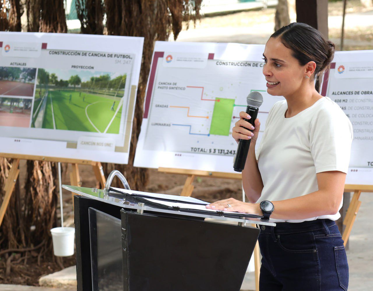 “El compromiso se ve reflejado en este banderazo de inicio de la construcción de la Cancha de Fútbol que beneficiará directamente a 25 mil 500 cancunenses; quiero reconocer la unidad entre vecinos y gobierno para llevar a cabo este proyecto, estas acciones demuestran nuestro amor por Cancún, por un desarrollo que favorezca a todas y todos”, dijo.