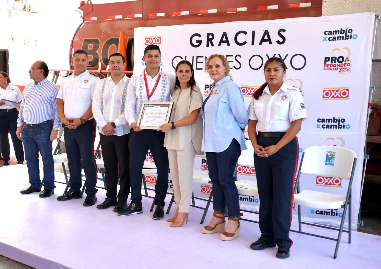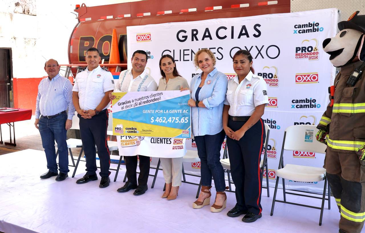 Cancún, Q. R., a 24 de julio de 2024.- La Presidenta Municipal, Ana Paty Peralta en compañía de autoridades administrativas del Heroico Cuerpo de Bomberos y su Patronato, recibieron por parte de la tienda comercial OXXO un donativo por 462 mil 475.65 pesos recaudado a través del programa de “Redondeo Clientes OXXO”, que tiene como propósito crear conciencia sobre las necesidades de grupos vulnerables y servir como un canal de recaudación de fondos para organizaciones, asociaciones e instituciones.