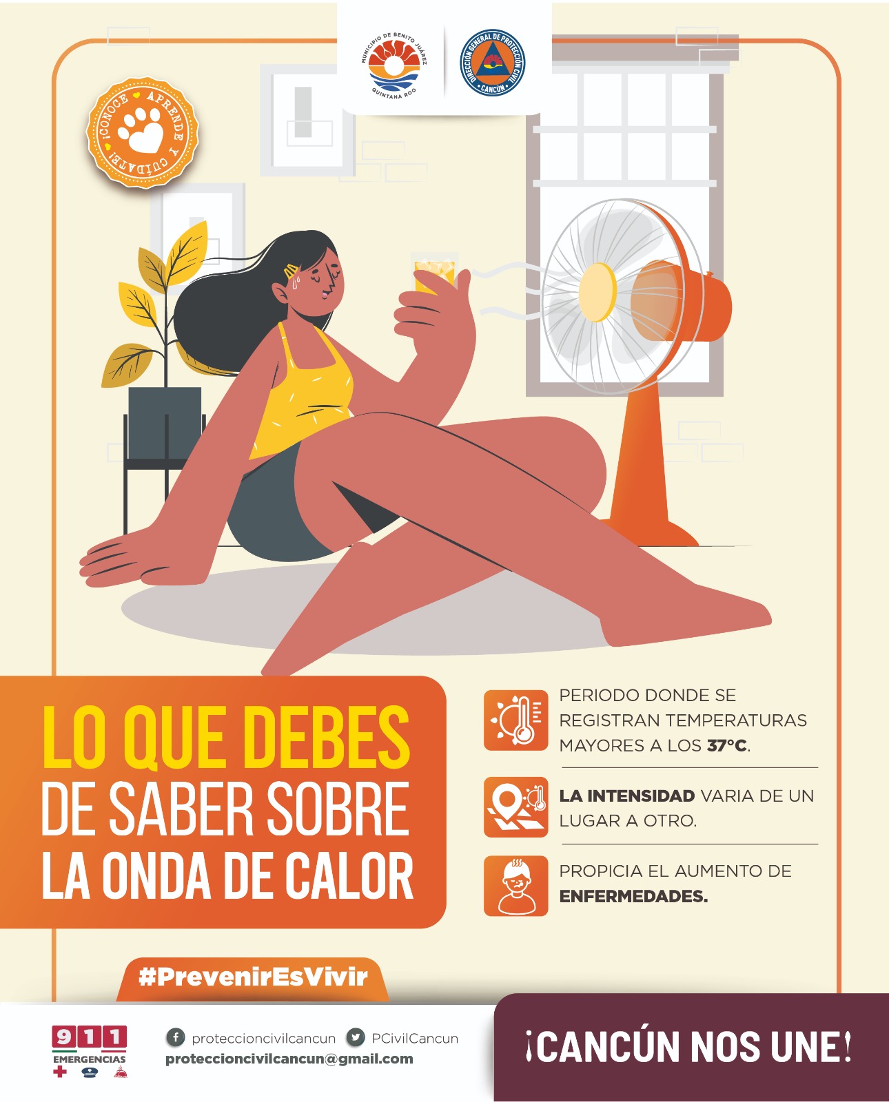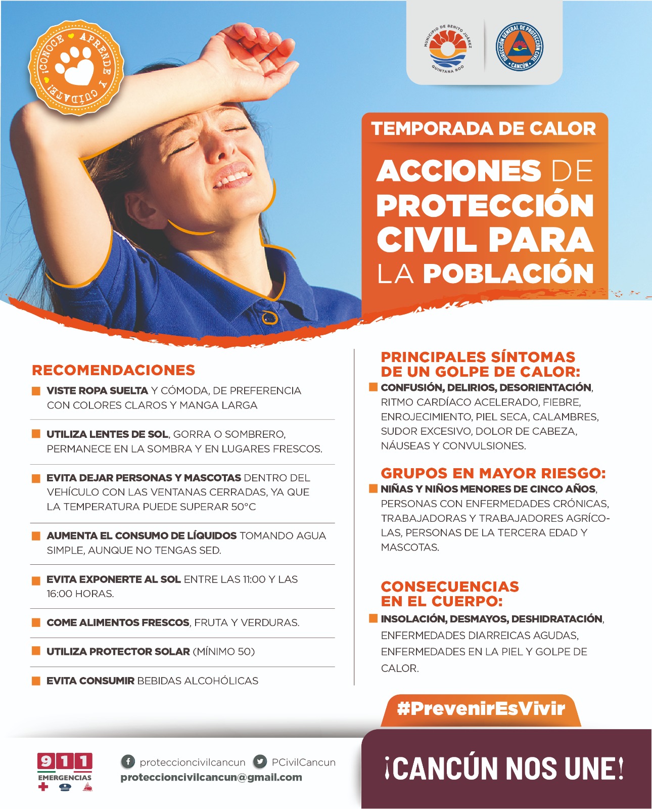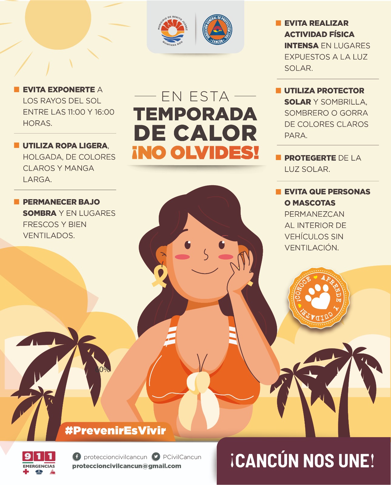 Cancún, Q.R., a 12 de junio de 2023.- El gobierno municipal de Benito Juárez, a través de la Dirección General de Protección Civil, emitió ciertas recomendaciones para prevenir “golpes de calor” a consecuencia de la tercera “Onda de Calor”, que prevalecerá en el territorio nacional, principalmente en el estado de Quintana Roo.