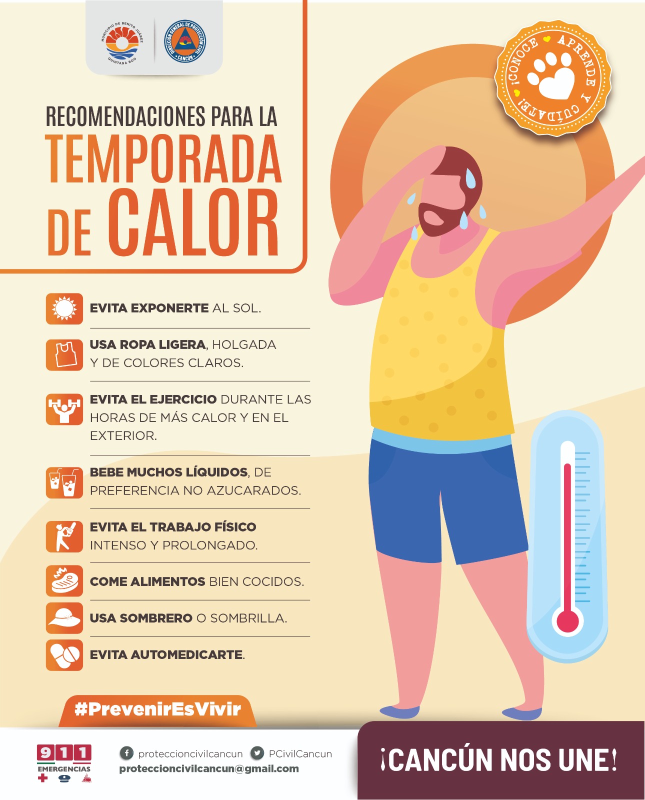 El director de la dependencia, Antonio Riveroll Ribbon, tal como ha insistido la Presidenta Municipal, Ana Paty Peralta, recomendó a las y los cancunenses, mantenerse hidratados; principalmente a adultos mayores y niños no exponerse a la luz solar por mucho tiempo; usar bloqueador solar cada tres horas; utilizar gorra, sombreros y sombrillas para protegerse del sol, así como refugiarse en lugares frescos para evitar que el cuerpo resienta la temperatura calurosa.