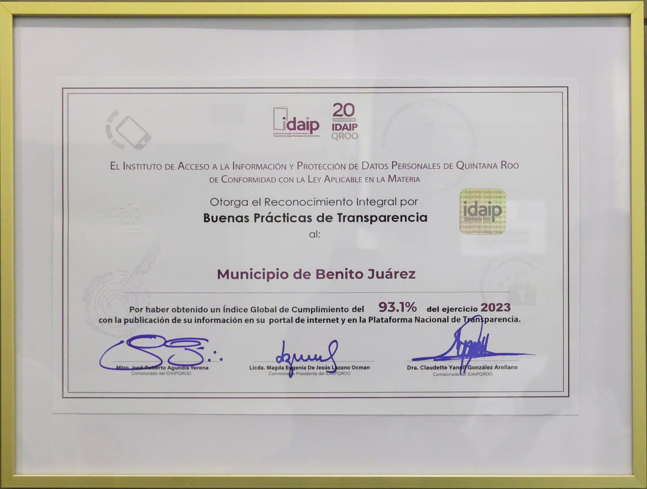 (IDAIPQROO), por alcanzar el índice global de cumplimiento de las Obligaciones