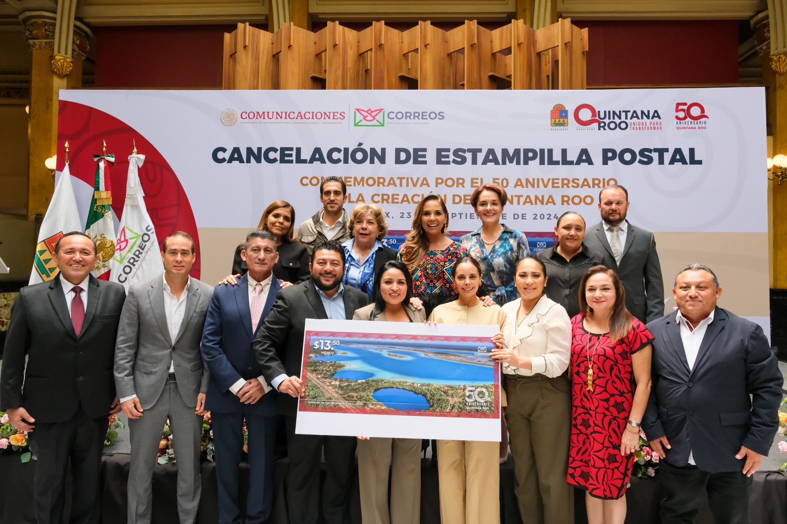 Posteriormente, en el Palacio Postal, presenció la cancelación de la estampilla postal conmemorativa por el 50 Aniversario de la creación de Quintana Roo, que tiene la imagen de un paisaje de Bacalar impresa en 300 mil unidades, para que esté presente en cartas o paquetes que entregue el Servicio Postal Mexicano (SEPOMEX), por lo que estuvo presente su directora, Rocío Bárcena Molina.
