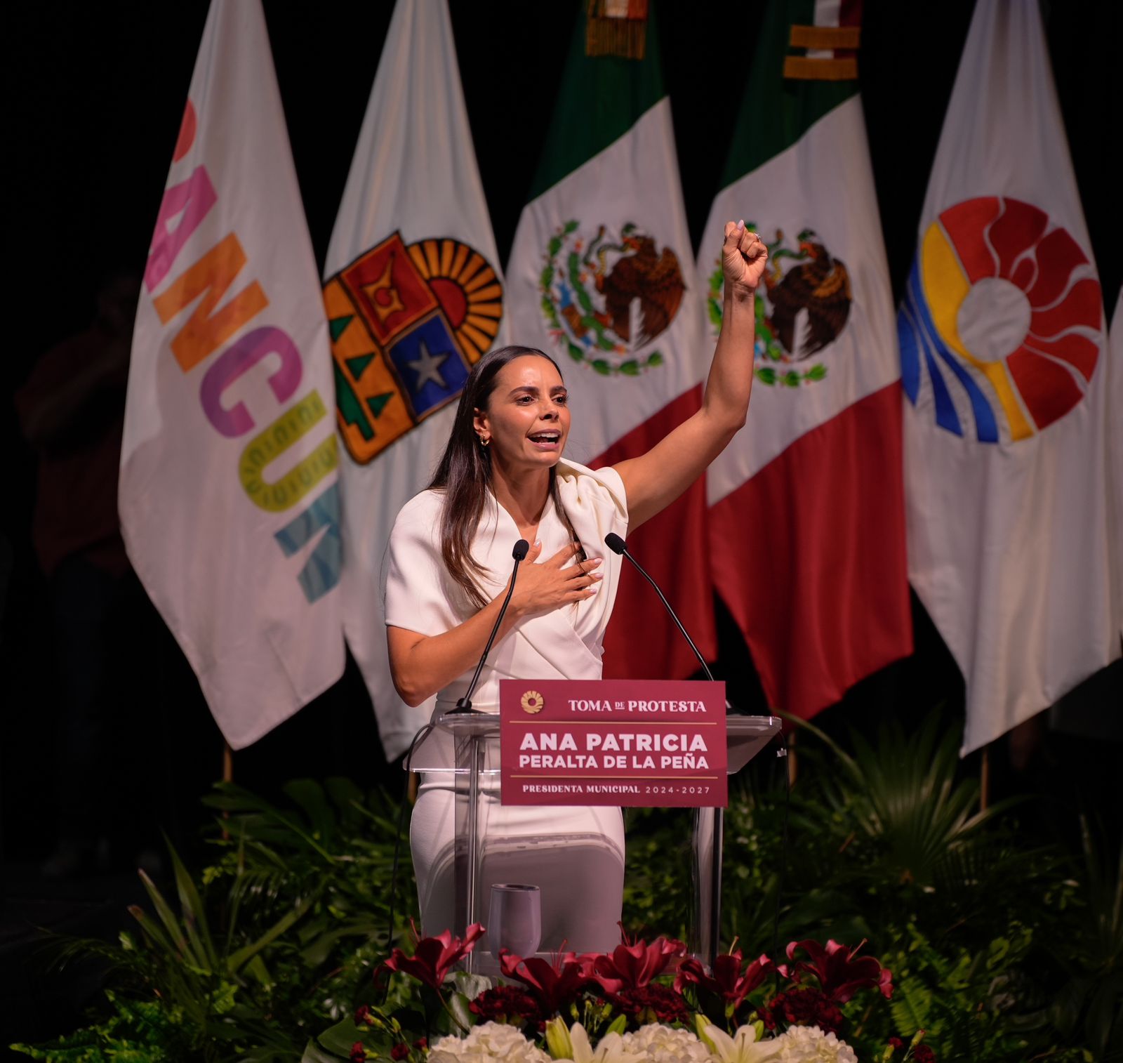 Cancún, Q. R., a 30 de septiembre de 2024.- “Hoy, en el inicio de esta nueva administración, quiero transmitirles esta visión, para que con sus ideas y su trabajo en equipo, lo hagamos realidad. Aspiramos a una Ciudad del Bienestar, donde convivamos en paz y trabajemos juntos, recuperando nuestros valores; donde todas las familias tengan calidad de vida y servicios públicos eficientes; y donde niñas y niños vivan en un entorno seguro y pueden cumplir sus sueños”, afirmó la Presidenta Municipal, Ana Paty Peralta, al tomar protesta para esta encomienda en la administración 2024-2027, ante la gobernadora Mara Lezama y representantes de todos los sectores sociales.